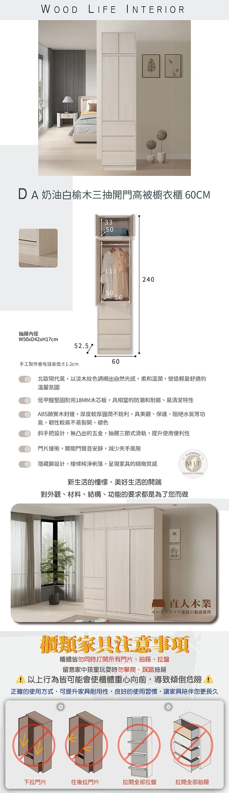 直人木業-RJ現代奶油風長門開門衣櫃組240公分(單吊+雙吊+三抽)