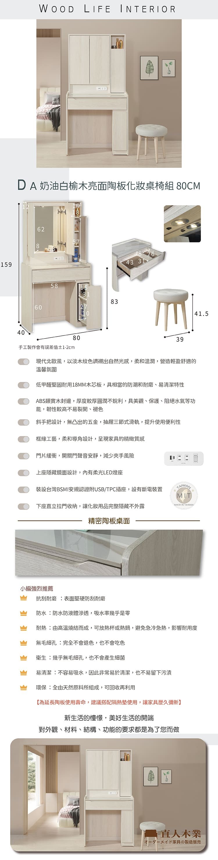 直人木業-DA奶油白榆木亮面陶板化妝桌椅組80公分