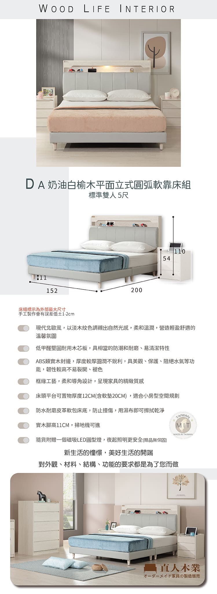 直人木業-DA奶油白榆木平面立式圓弧軟靠床組-標準雙人5尺