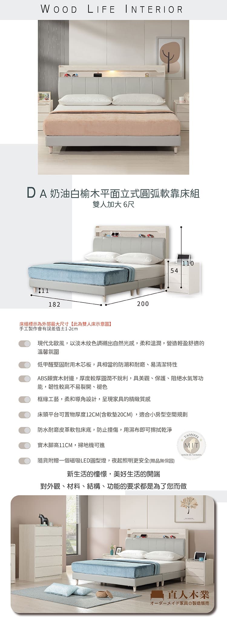 直人木業-DA奶油白榆木平面立式圓弧軟靠床組-雙人加大6尺