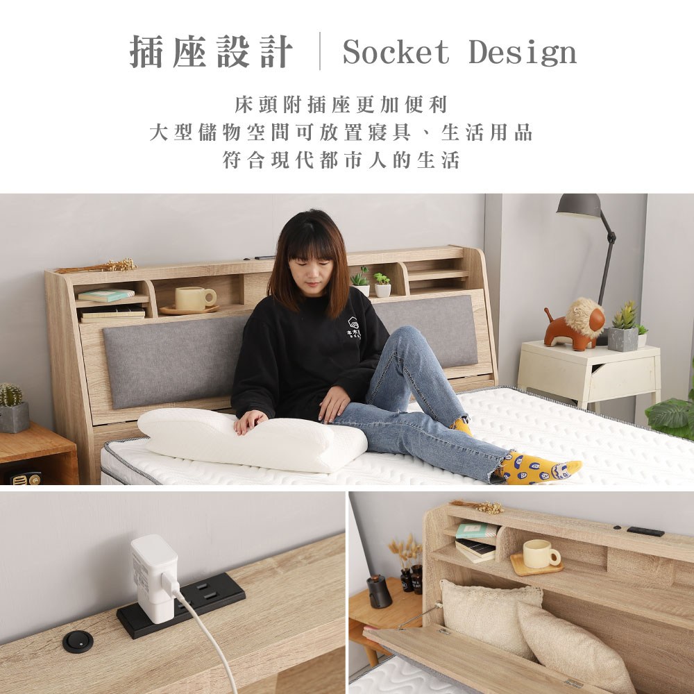 IHouse-山田 日式插座燈光房間二件組(床頭+六分床底)-雙人5尺古橡