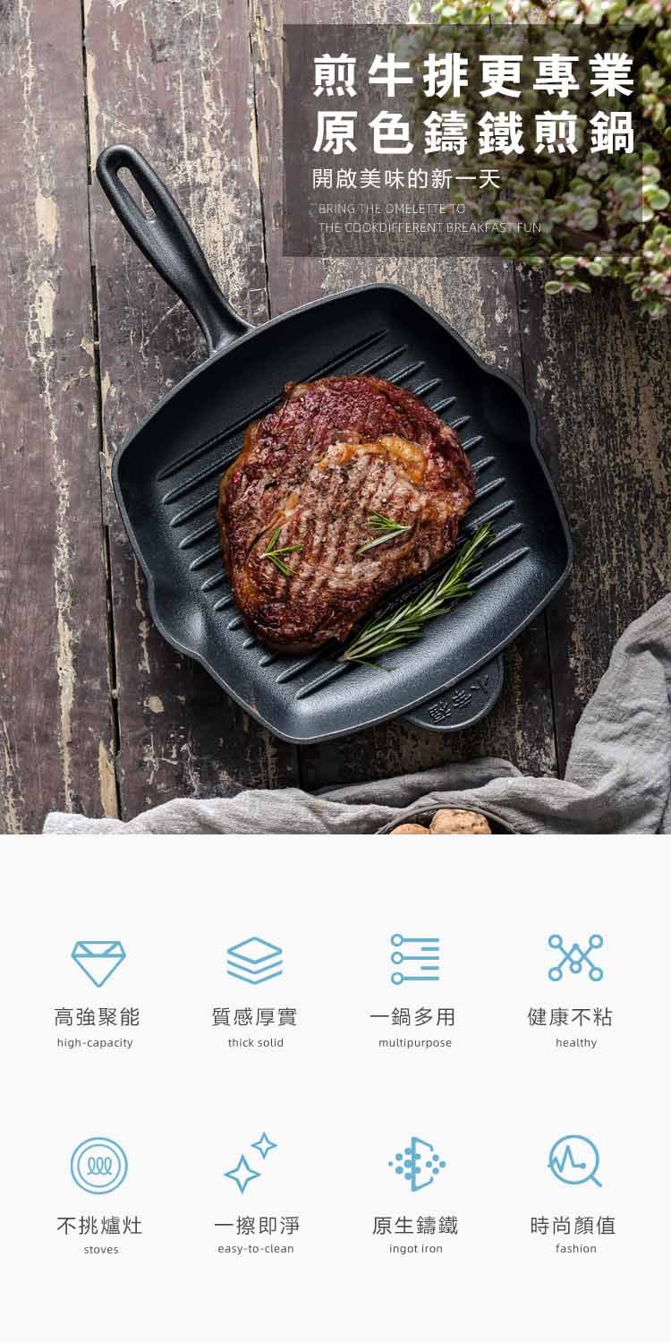 26CM加厚鑄鐵牛排煎鍋/條紋牛排鍋/無塗層不粘家用煎牛扒專用鍋/平底煎鍋26CM專業牛排煎鍋