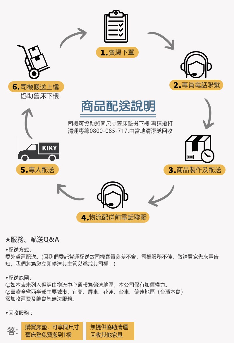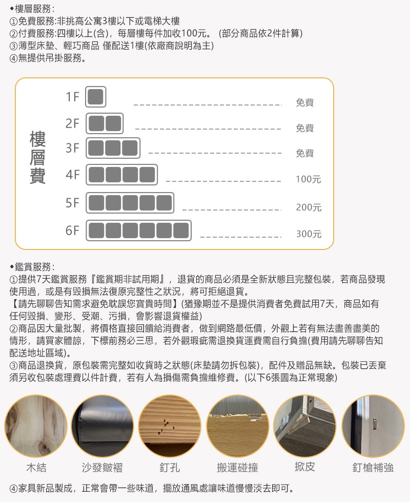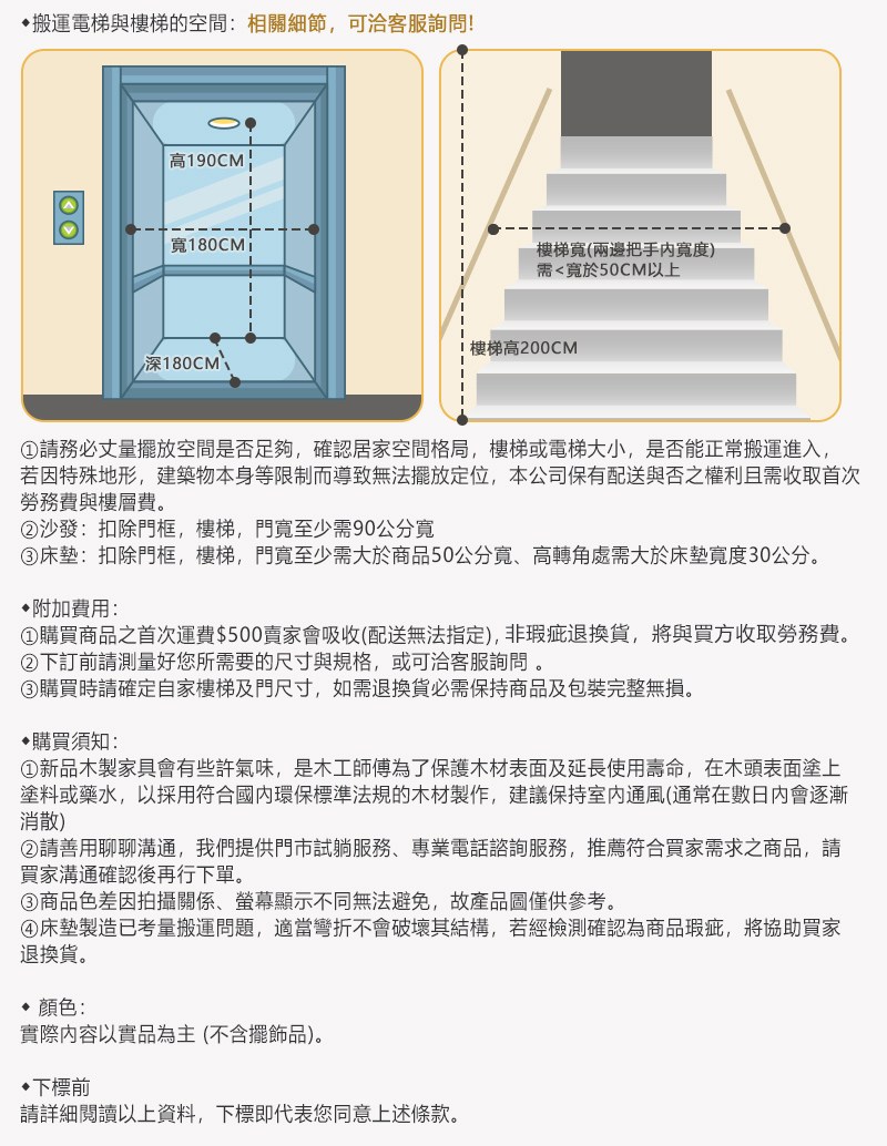 | ★配送小提醒: ※預計約7-10個工作天配送,不包含假日與國定假日。 ※免費提供同尺寸1:1床墊搬至1F服務。 ※僅配送至台灣本島,外島(金門/澎湖/綠島...等)暫無配送。屏東及偏遠地區運費,您可先行下單,後續由專員致電報價)。 ※大型商品請務必自行確認樓梯以及進出門口範圍之尺寸,請於購買前先行測量空間大小、距離,以免因地形地物限制無法進入而導致無法配送造成爭議。 ※家具配送無法指定送貨時間,將有專人與您聯繫確認物流費用及配送日期,請留意陌生來電。 ★配送方式: 委外貨運配送。(因我們委託貨運配送故司機素質參差不齊,若因運送過程造成您商品損毀,司機服務不佳,敬請買家先來電告知,我們將為您立即轉達其主管以懲戒其司機,並為您更換商品唷。) ★配送範圍: 1.如本表未列入但經由物流中心通報為偏遠地區,本公司保有加價權力。 2.加價運送服務為單趟計費,若有退換貨之情形加價運費無法退還。 3.臺灣全省西半部主要城市,宜蘭、屏東、偏遠地區(台灣本島)需加收運費及離島恕無法服務。 ★指定時間:因大型傢俱有組裝、配送的問題,並非一般快速到貨商品,無法指定特定時間送達,配送前1-2天司機會提前1-2天聯繫您,請留意陌生來電。 ★回收服務 : 此商品不提供回收服務,若需回收家俱可聯絡當地請清潔隊回收,免付費清運專線0800-085-717。 ★樓層服務: 1.3樓以下+電梯免樓層費,4樓單購以上加收100元(含)、掀床.衣櫃及雙層床每層樓加收200元,樓層疊加。(部分衣櫃以及沙發由專員告知) 2.大樓如有電梯,以電梯載運為主。 3.需以吊車吊運以當地吊車行情計,費用由消費者支付,廠方無提供吊掛服務。 4.購買時請確定自家樓梯及門尺寸,如需退換貨必需保持商品及包裝完整無損。 (沙發:扣除門框,樓梯、門寬至少需90公分寬) 5.床墊製造已考量搬運問題,適當彎折不會破壞其結構。 6.商品如有任何毀損、變形、受潮、污損,會影響退貨權益。 7.商品退換貨,原包裝需完整如收貨時之狀態,配件及贈品無缺。包裝已丟棄須另收包裝處理費以件計費,若有人為損傷需負擔維修費。 8.運送服務為單趟計費,商品退換貨時,如本商品有基本運費及偏遠地區附加運費,運費則無法退還。 9.超過鑑賞期,不接受退換貨。 ★請注意: 1.本產品僅接受產品瑕疵退換貨,若產品本身瑕疵或運送過程導致新品瑕疵,請在鑑賞期內盡快告知以便處理,另外如果商品一經組裝,則無法退貨,只能更換零件。 2.部分新品商品會有味道(乳膠床墊、皮革沙發…等),就跟買新車時打開車門會有牛皮&塑膠味道..等,統稱新車味的原理一樣。 3.顏色:網頁產品因拍攝關係,故產品圖僅供參考,實際內容以實品為主 (不含擺飾品)。 4.由於庫存管理不便,若因產品缺貨或特殊地型限制無法送達時,本公司保有出貨與否之權利。 5.下訂前請測量好您所需要的尺寸與規格,訂錯規格貨運會需加收費用1000/件(當場支付)。 6.尺寸為師傅手工製作人工丈量略有誤差值±3cm,請以實品為主。 ★床墊保養: 1.定期翻轉和旋轉:每三到六個月將床墊前後翻轉,並且上下旋轉一次,防止因長期使用一側造成凹陷和不均勻磨損。 2.使用床墊保護套:使用防水、防塵的床墊保護套,這樣可以防止汗水、汙漬和灰塵進入床墊,保持床墊清潔。 3.定期清潔:每月使用吸塵器清潔床墊表面,這樣可以清除灰塵和塵蟎。汙漬可使用濕布輕輕擦拭,避免使用大量水分,以防潮濕。 4.保持通風:確保臥室有良好通風,可防止床墊受潮和發霉。偶而開除濕機,除去空氣中的濕氣和異味。 5.避免過度負重:不要在床墊上跳躍或放置過重的物品,以防止內部彈簧或填充物損壞。 6.床邊四周不可坐:避免長時間坐在床墊邊緣,這樣會導致邊緣的彈性和支撐力減弱,影響整體使用壽命。 ★下標前請詳細閱讀以上資料,下標即代表您同意上述條款。 |
