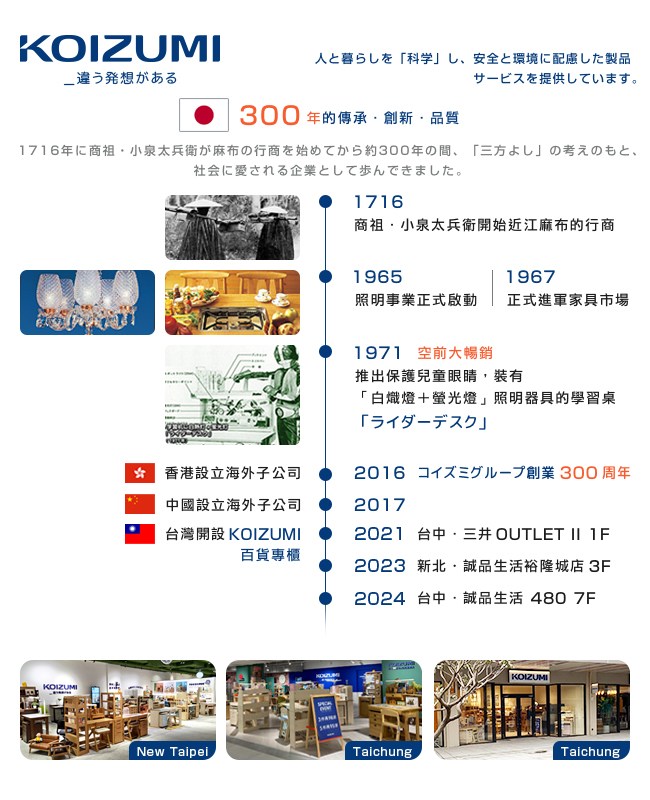 西元 1716 年成立,商祖小泉太兵衛開始麻布的行商,創業 300 年來,遵循「三方好」(近江商人所提倡的買方好、賣方好、世間好)的思想,作為受到社會喜愛的企業發展至今天。今後【KOIZUMI】也將運用多年來所培養出來的技術與經驗,看準時代趨勢,努力向前邁進,以便為社會作出廣泛的貢獻。日本原裝進口百年品牌,兒童家具市佔率 NO.1,周到細節與細膩品質,長期受到日本的家長信賴。