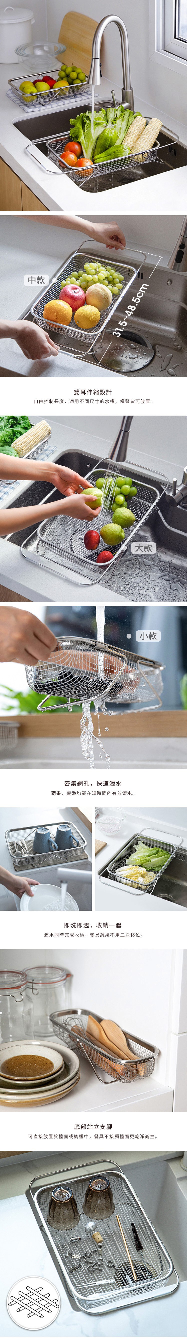 【日本霜山】304不鏽鋼水槽用伸縮式蔬果/餐具瀝水籃-中