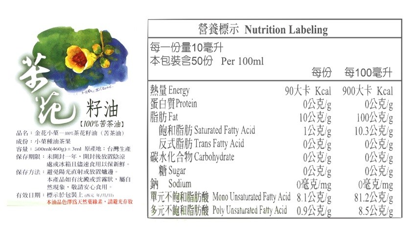 這款【金椿金花小果-茶花籽油500ml】油色青綠如翡翠,第一道自然壓榨,保留了茶籽原汁原味,小菓果實像珍珠的大小,果肉帶黃綠色,油色青綠如翡翠,含有天然葉綠素、茶多酚、α-生育醇及高單元不飽和脂肪酸80%以上。發煙點高達攝氏可達210℃以上,油脂的香氣如青草的氣息、滑潤爽口的口感,適合直接生飲養身、沙拉沾食、煎煮炒拌,除了直接食用外,油質吸收效果好,可以直接塗抹皮膚及頭髮,維持肌膚與毛髮的滋潤、保濕。