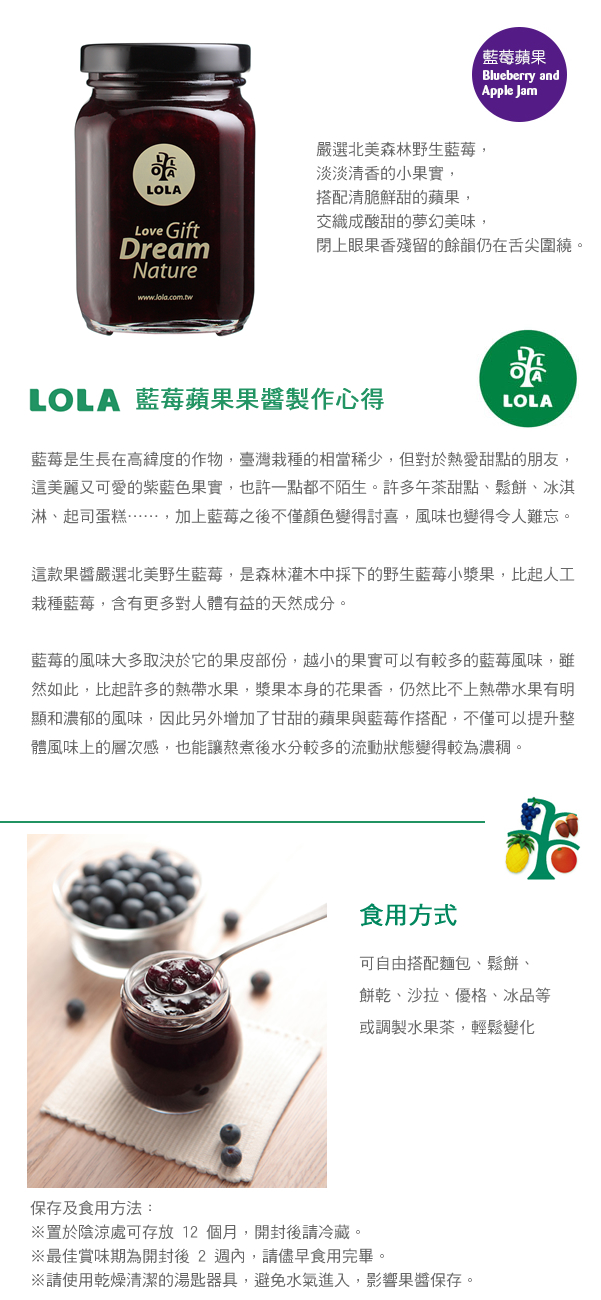 這款【LOLA 藍莓蘋果果醬】 嚴選北美森林野生藍莓,淡淡清香的小果實,搭配清脆鮮甜的蘋果,交織成酸甜的夢幻美味,閉上眼果香殘留的餘韻仍在舌尖圍繞。 是值得細細品嚐的美味。藍莓: 野生、蘋果: 有機栽培,手工熬煮,藍莓富含花青素 高抗氧化成分。水果含量 70% 以上,低糖果醬,無防腐劑、色素、香料,美味更無負擔~可自由搭配麵包、鬆餅、餅乾、沙拉、優格、冰品等或調製水果茶,輕鬆變化~