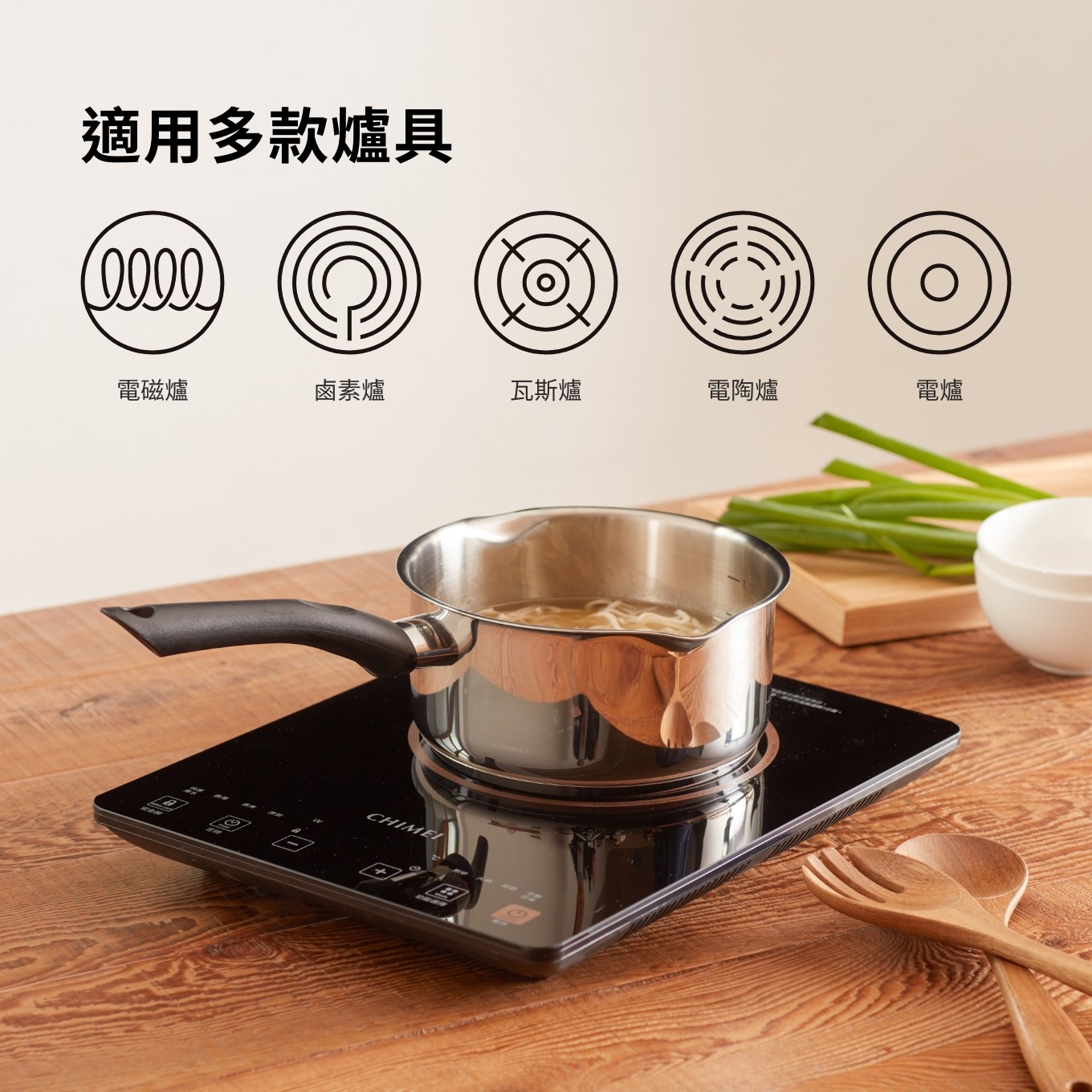 三層複合不鏽鋼導磁鍋底,加厚底部結構能使受熱更快速均勻。考量現代多元料理需求,適用於直火瓦斯爐、電爐、電磁爐、鹵素爐、電陶爐、IH 感應爐、黑晶爐等多種爐具,使用更方便。