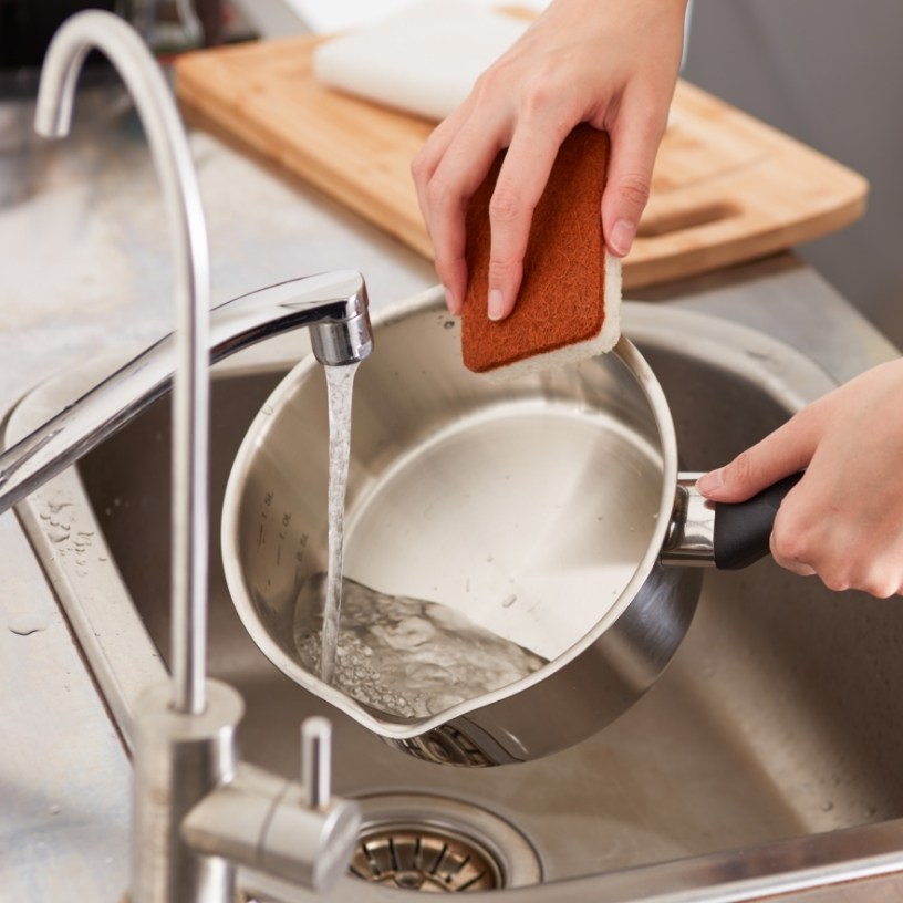 首次使用前請以少許白醋加水約2/3鍋加熱至水滾後倒掉,再用中性洗滌劑及海綿仔細清洗,以紙巾擦拭或晾乾(如仍有髒汙請再重複幾次上述步驟)。如遇鍋底出現些微焦痕,可加入清水煮滾、使油垢軟化,再加入小蘇打粉和醋浸泡,分解燒焦碳化後再刷洗。