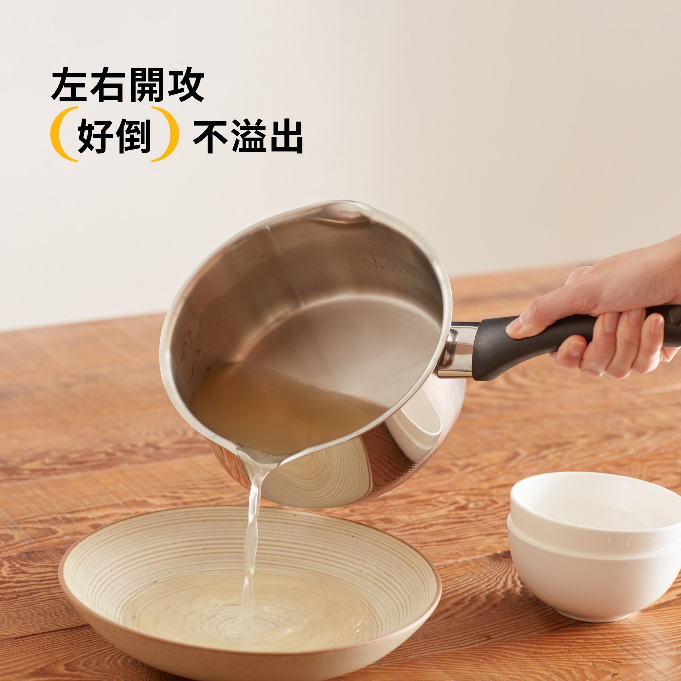 雙邊導流口,左右手使用皆方便,隨手一握、傾倒料理,下廚更順手。特別導角弧度設計,湯水倒出不易回漏,避免滴落檯面造成紛亂,輕鬆維護環境。