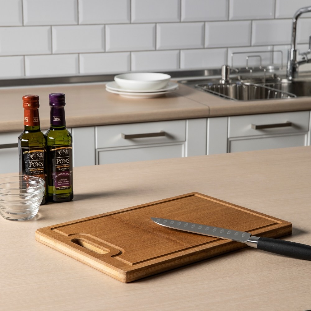 這款【一片竹砧板-經典手提款】採用竹製高密度壓製而成,天然環保,散發自然和風,簡單高貴,好清洗不殘留,且手感溫潤,用起來更順手。邊緣凹層設計,保持桌面清潔,使用處理食材更便利。提把設計,方便拿取 ,居家生活的好幫手。