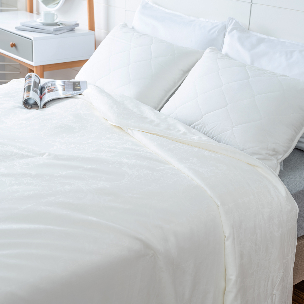 以緹花抗菌表布,及長纖蠶絲填充,柔軟蓬鬆,保暖透氣舒適,吸濕排汗效果佳,暖度與細緻手感一次擁有!