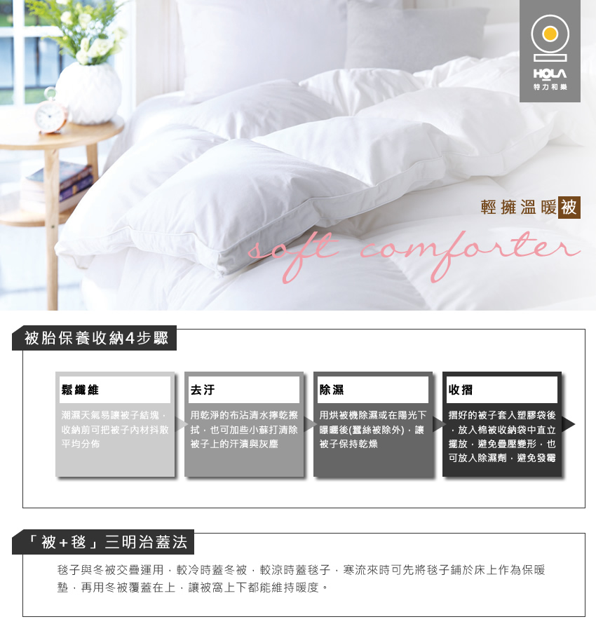保養方法簡單,平時可搭配套上不同花色被套,除可防止髒汙外,也可增添居家裝飾的美感;此外,產品貼心附加收納袋,方便歸納整理,質地輕柔特性,提供極佳柔棉舒服觸感喔~