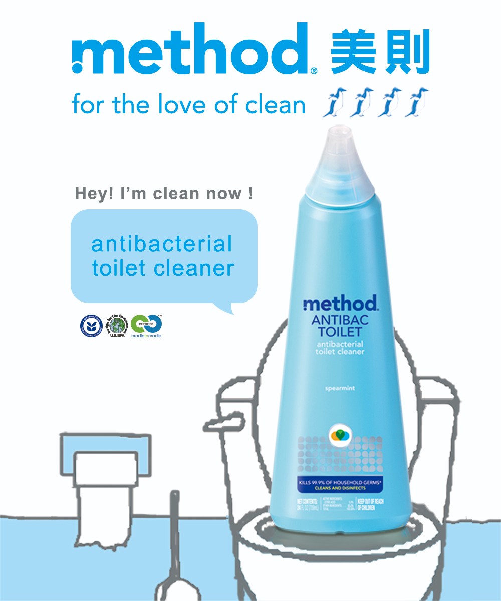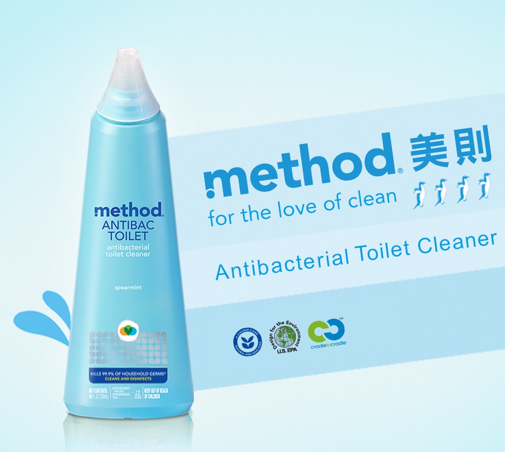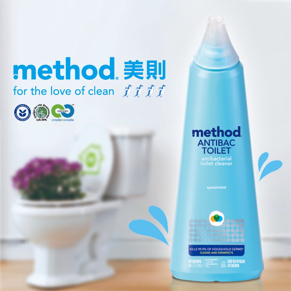 Method 美則菌終極者專對抗馬桶頑固的髒污及形成的一圈污垢,透過草本植物與檸檬酸的清潔效果加上玉米及椰子萃取的植物成份,不含漂白劑;深層清潔、脫臭與去除鈣質,沒有刺鼻的化學藥味,只有薄荷尤加利的清新香氛。