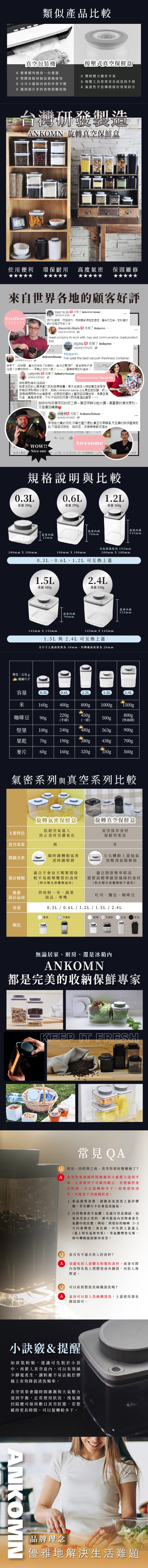 ANKOMN擁有旋轉即真空的專利技術,將會是您使用過所有真空保鮮盒中的全新體驗!轉動瓶蓋上的旋鈕即能抽真空,適合冰箱收納鮮食蔬菜、寵物各類零食、乾香料收納、咖啡豆茶葉收納,保存風味更持久。