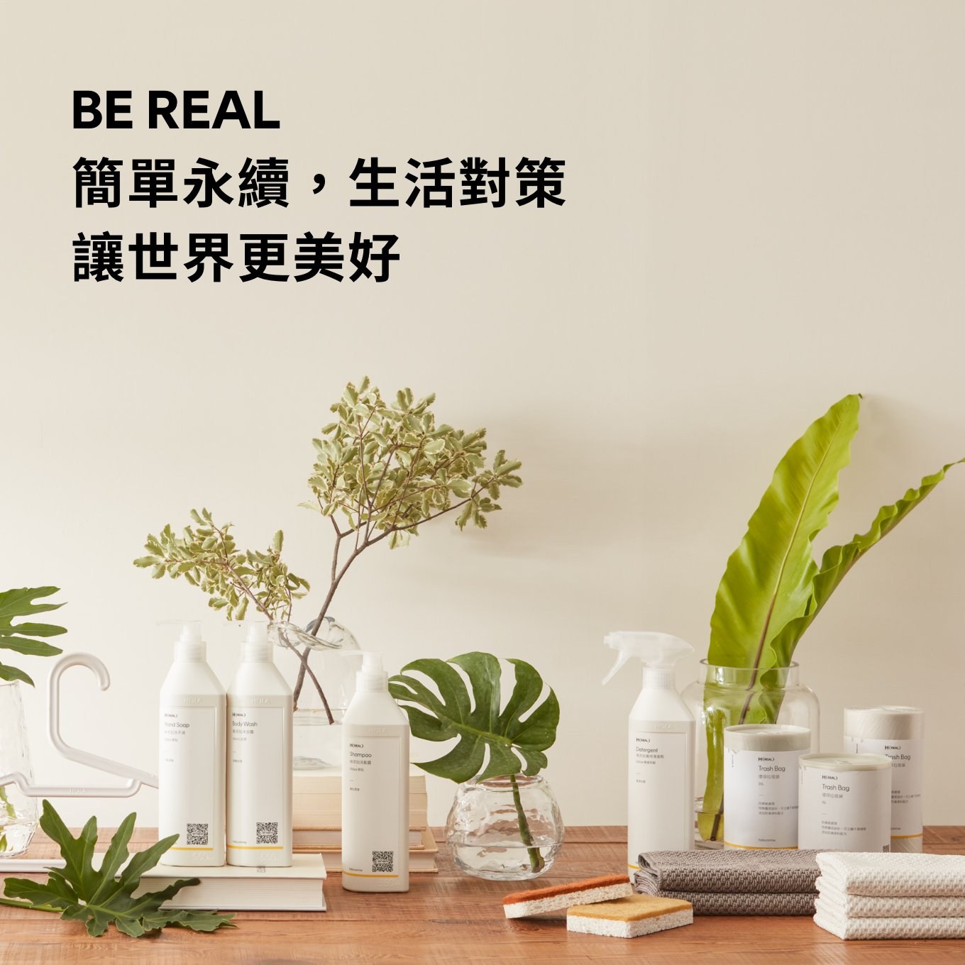HOLA REAL 系列以天然無塑、自然降解、回收再生為三大永續核心,根據台灣在地需求,設計兼具實用機能與簡約美學的生活用品,並給予環境保護安心承諾。透過有意識的選擇,從日常的小改變,輕鬆開展永續生活。