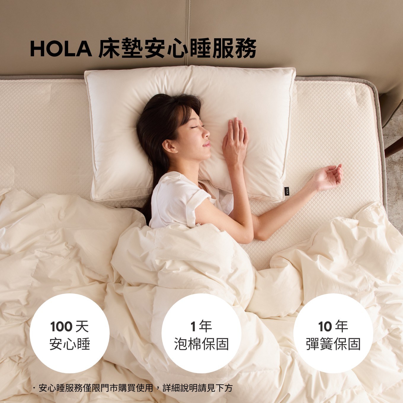 2.活動內容:凡於活動期間於HOLA和樂家居全台實體門市購買指定床墊,即可享有100天安心睡服務。100天安心睡服務期間內不滿意,享有一次退換貨服務。