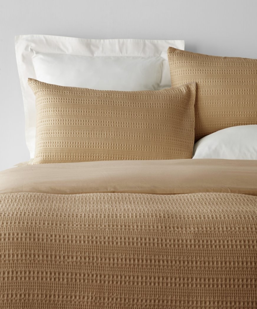 100% 純棉,運用獨特織法,織造出立體華夫格紋,觸感親膚舒適、吸濕透氣,搭配三款低彩度柔和色調:月牙白、焦糖橙、青瓷綠,伴你優雅享受輕盈好眠。