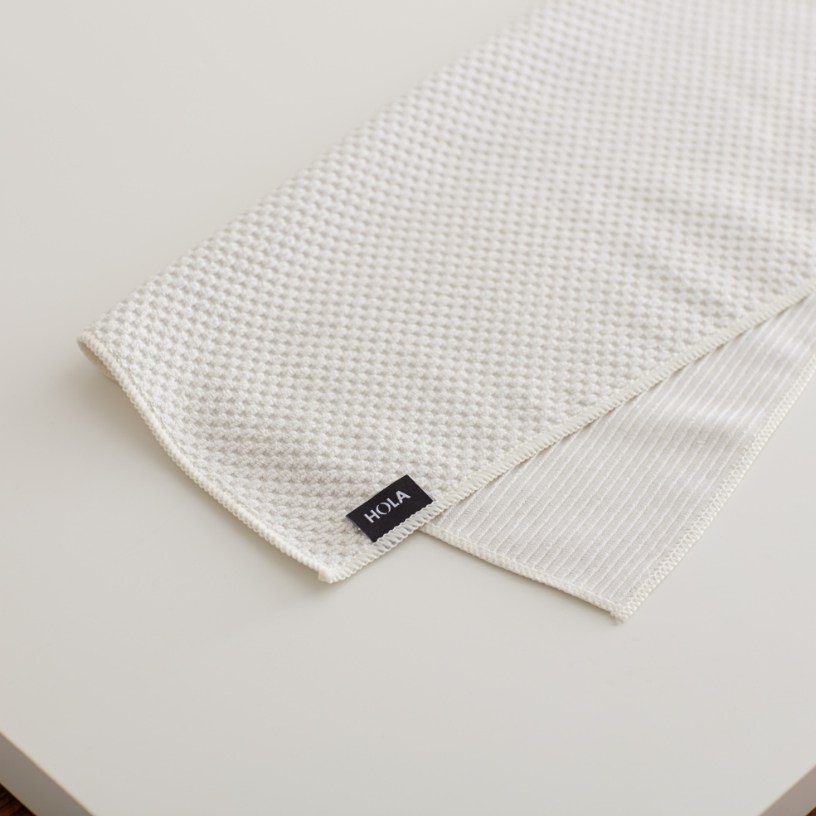 以多用途機能為理念,設計萬用抹布。雙面採用不同緹花織法,圓點面吸水、長條面刮油,手感厚實柔軟。三種簡約素色,白色、淺灰、深灰,可自然融入居家環境,並區分使用場域。