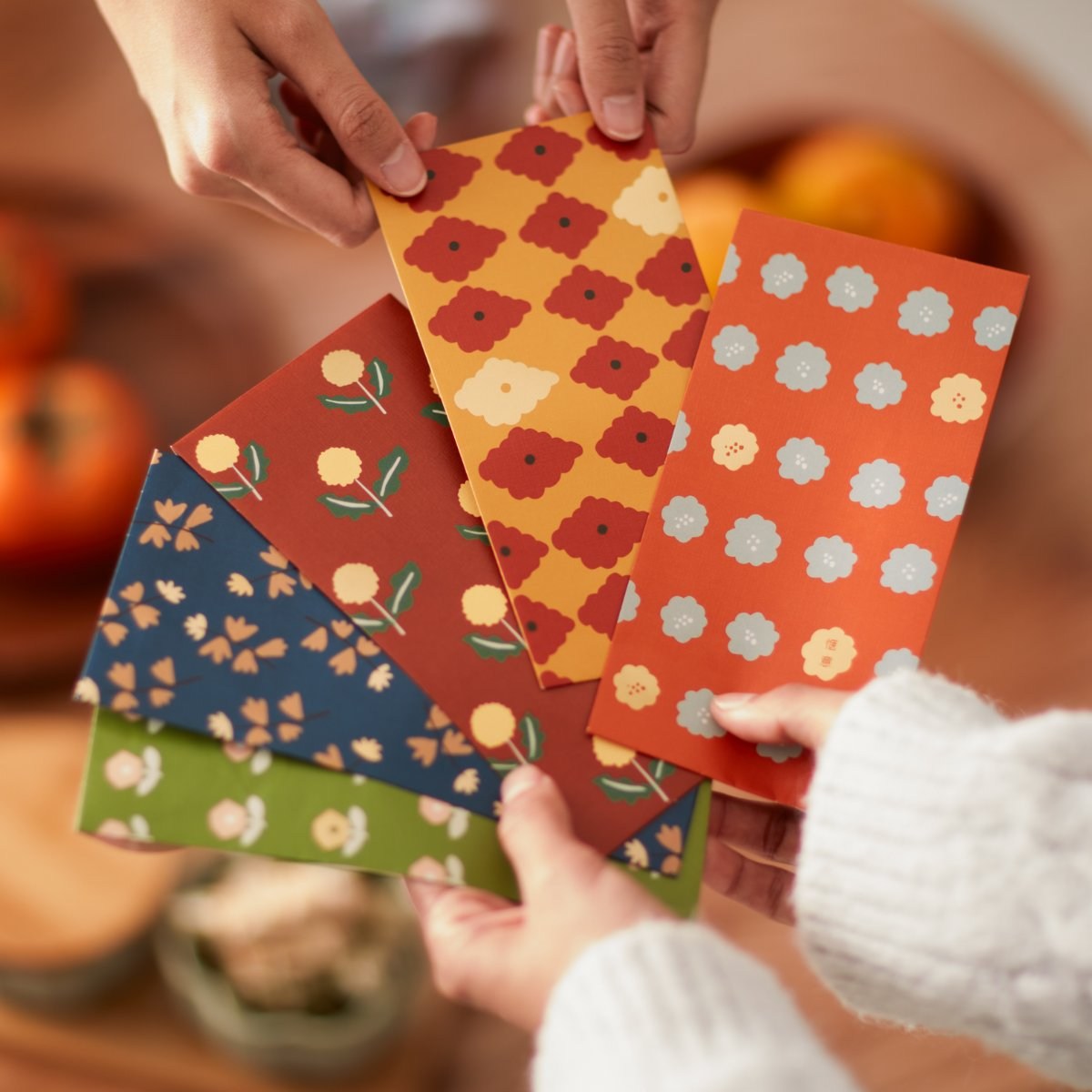 每個紅包都代表一份心意,獨特花版更為設計增添一絲新意。紙紅包組精選本島舍五種印花圖素:唯心、愜意、超己、做夢、自癒,各自代表著愛情、財運、事業、貴人運、健康等好運意涵。採用圓弧折口設計,有圓滿之意,打開折口就能看到每個圖素延伸出的祝福詩句;同時以燙金印刷,呼應農曆新年的喜氣,點亮居家過年氛圍。