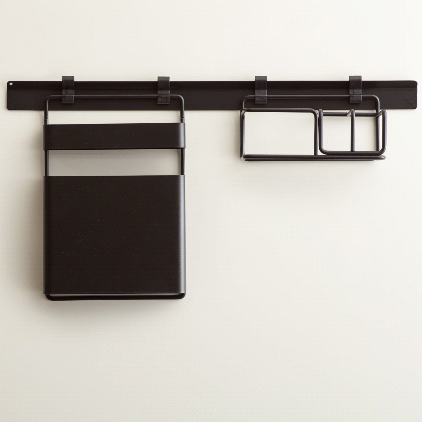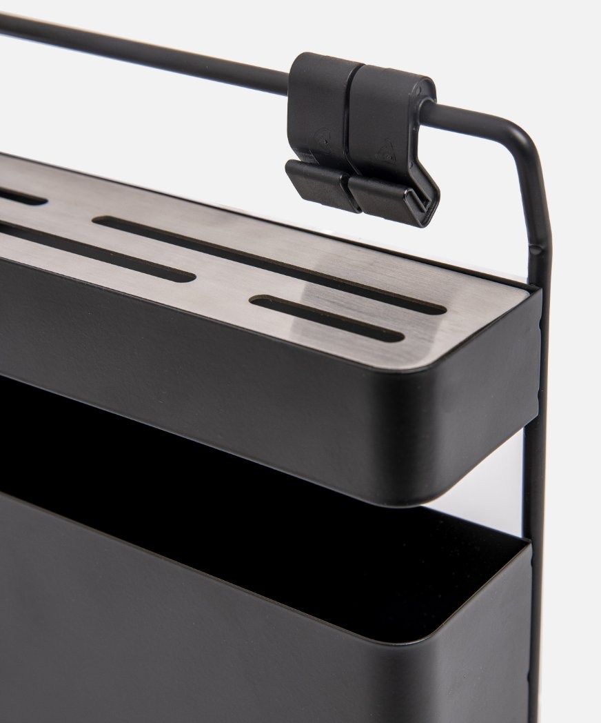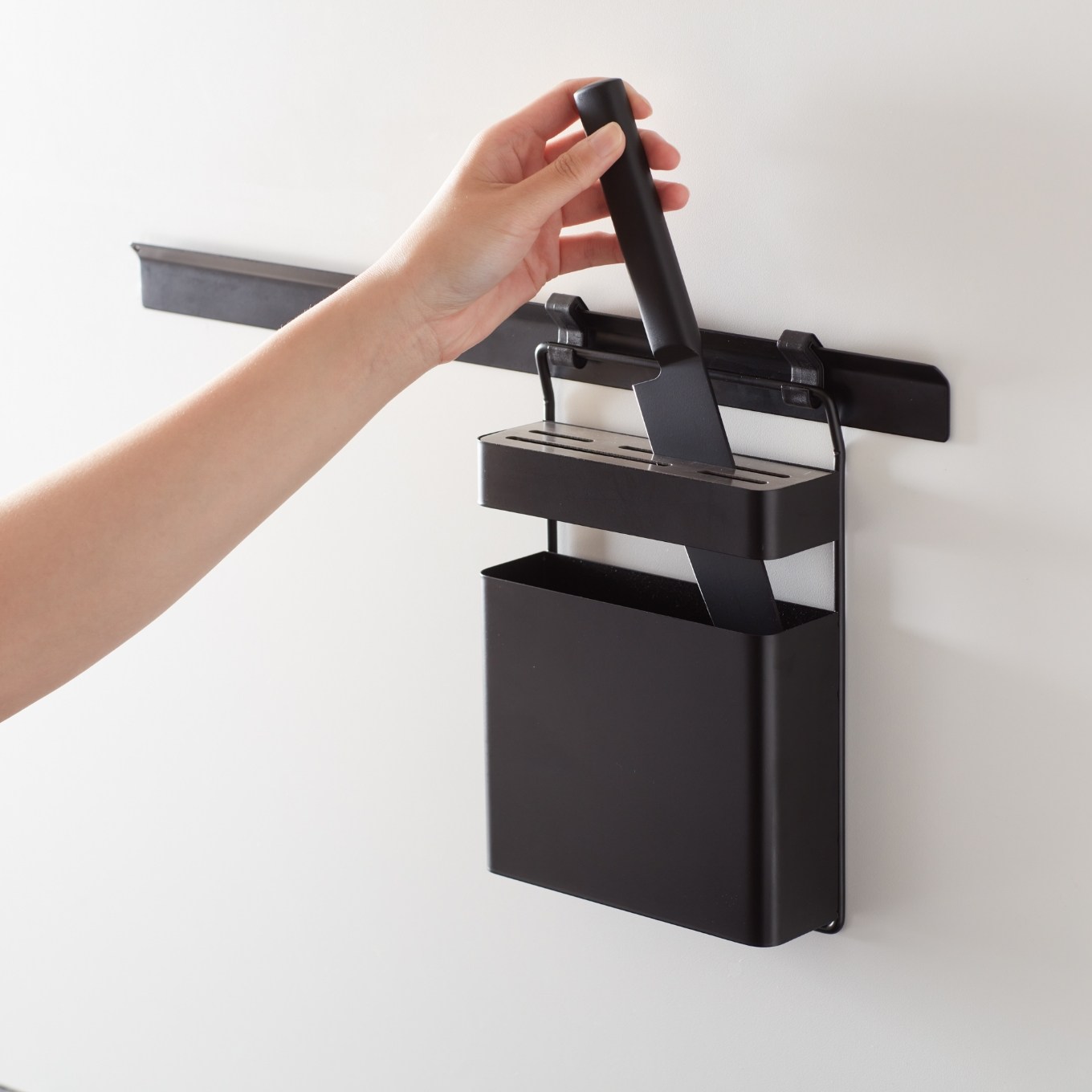 俐落沉穩的墨黑,完美貼合在牆面上,搭配 INK 壁掛掛桿,以模組化的方式,自由組裝、搭配喜愛的壁掛組合,透過簡約線條勾勒美型有序,形塑出屬於家的風格調性。在刀孔處拼接不鏽鋼片,防刮且不易生鏽,具兩種寬度、共計四個刀孔,貼心因應不同刀具尺寸。掛件附 2 個連結掛勾,壁掛掛桿另售。