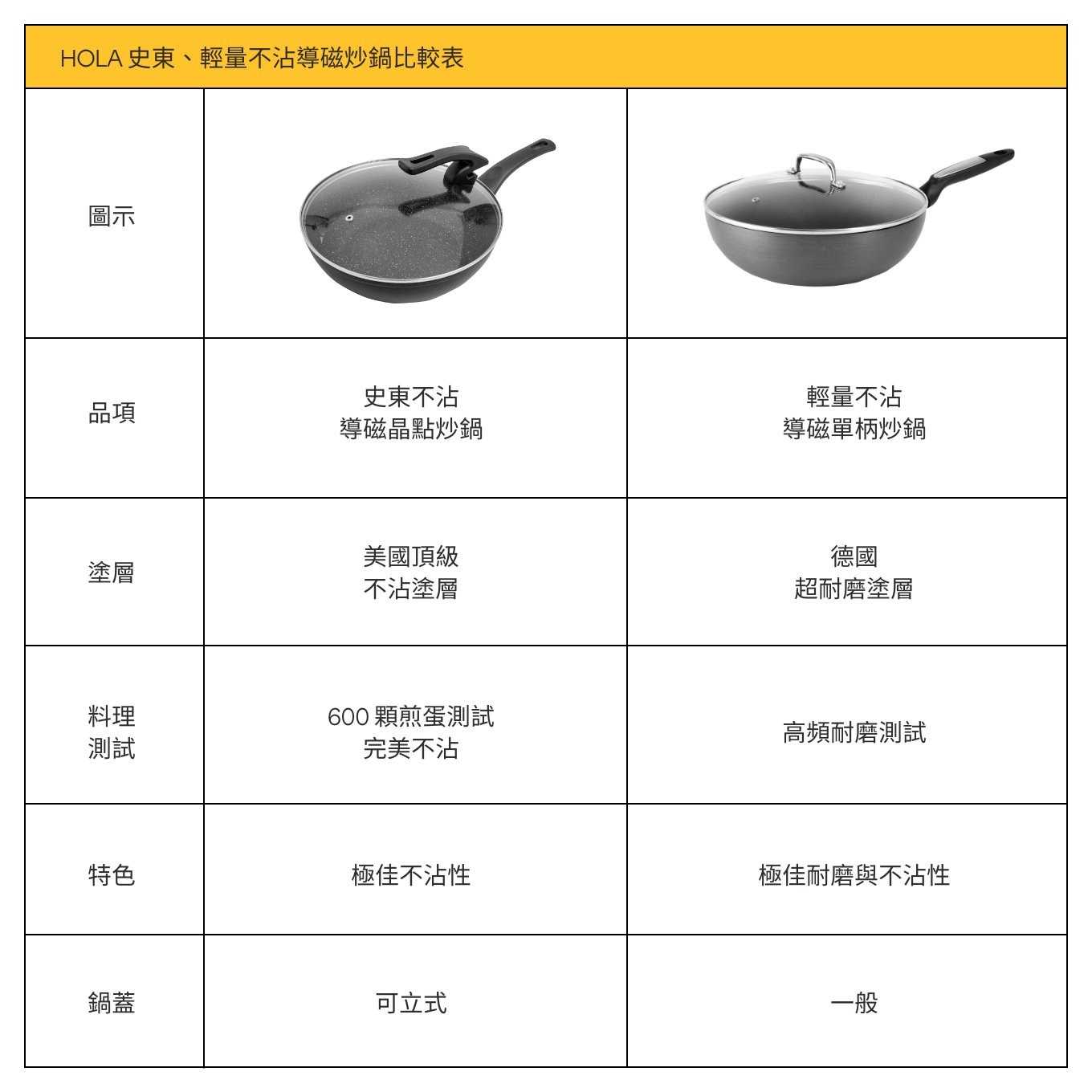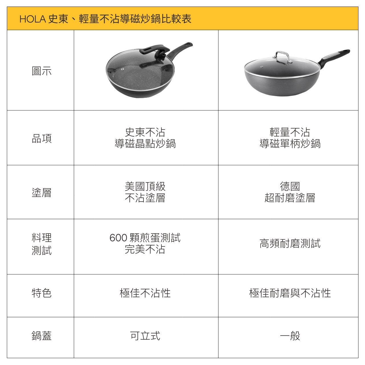 HOLA 團隊深入研究台灣人的飲食文化與烹煮習慣,開發出符合在地需求的鍋具。一鍋兩用的不沾炒鍋,平整底部方便煎魚、煎肉,搭配圓弧鍋邊深度,能輕鬆翻炒多種料理,用一鍋搞定一桌菜。選用美國頂級不沾塗層,僅需添加少量油,或依靠食物自身油脂即有效不沾黏,健康低油料理、享受美味無負擔。