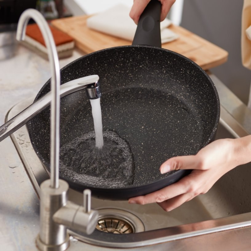 首次使用前,請用中性洗滌劑與清水將灰塵沖洗乾淨,加水燒滾後倒掉,再以軟布或廚房紙巾擦乾即可使用。一般清潔,可趁鍋具有餘溫時,倒入清水與中性洗滌劑,搭配軟質菜瓜布、海綿清洗,請勿使用鋼刷、硬質菜瓜布刷洗, 以免傷及鍋體不沾材質。