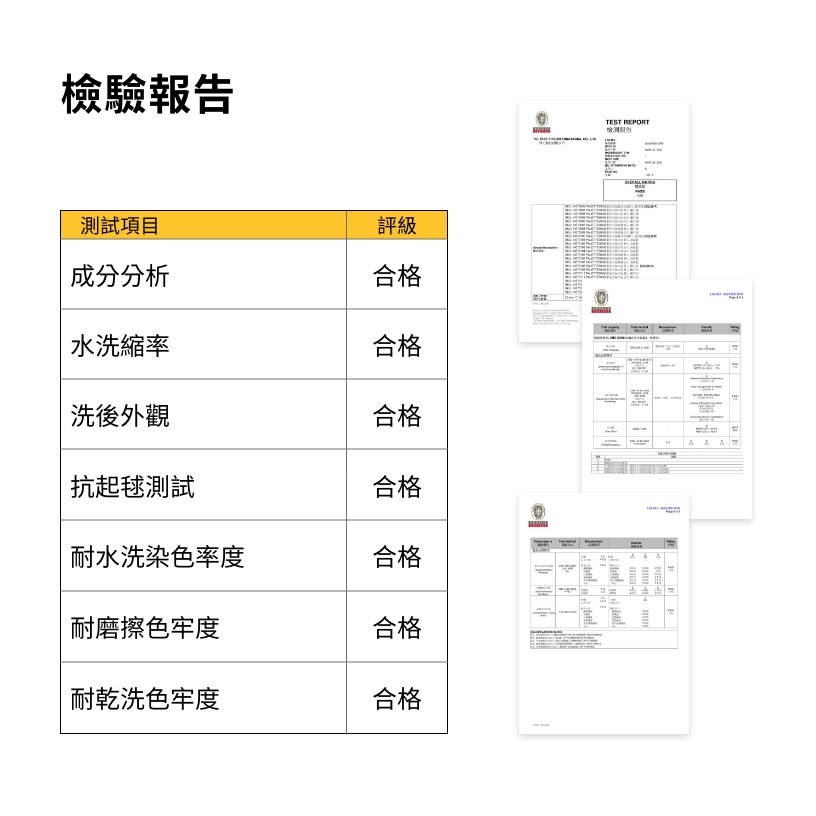 通過第三方測試機構認證,符合 CNS 15290 紡織品安全規範/水洗縮率/水洗後外觀/色牢度/偶氮甲醛符合法定含量規定/抗起球 3 級以上,為消費者把關品質,安全無虞。