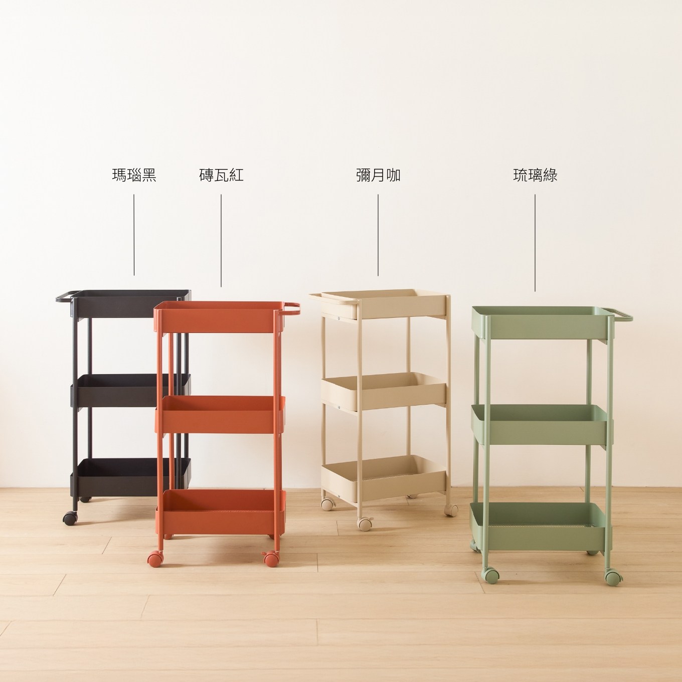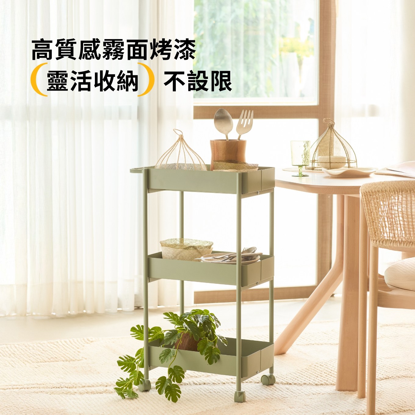 設計簡約俐落,一個人也能輕鬆組裝!4 種質感霧面烤漆色調,輕鬆融入各種空間。三層大容量,每層安全荷重達 8 kg,發揮最高坪效。通風網格乾爽透氣;360° 萬向滾輪,滑順好推亦可輕鬆固定;圓潤造型把手,靈活移動更便利,陪你玩轉美型收納日常。