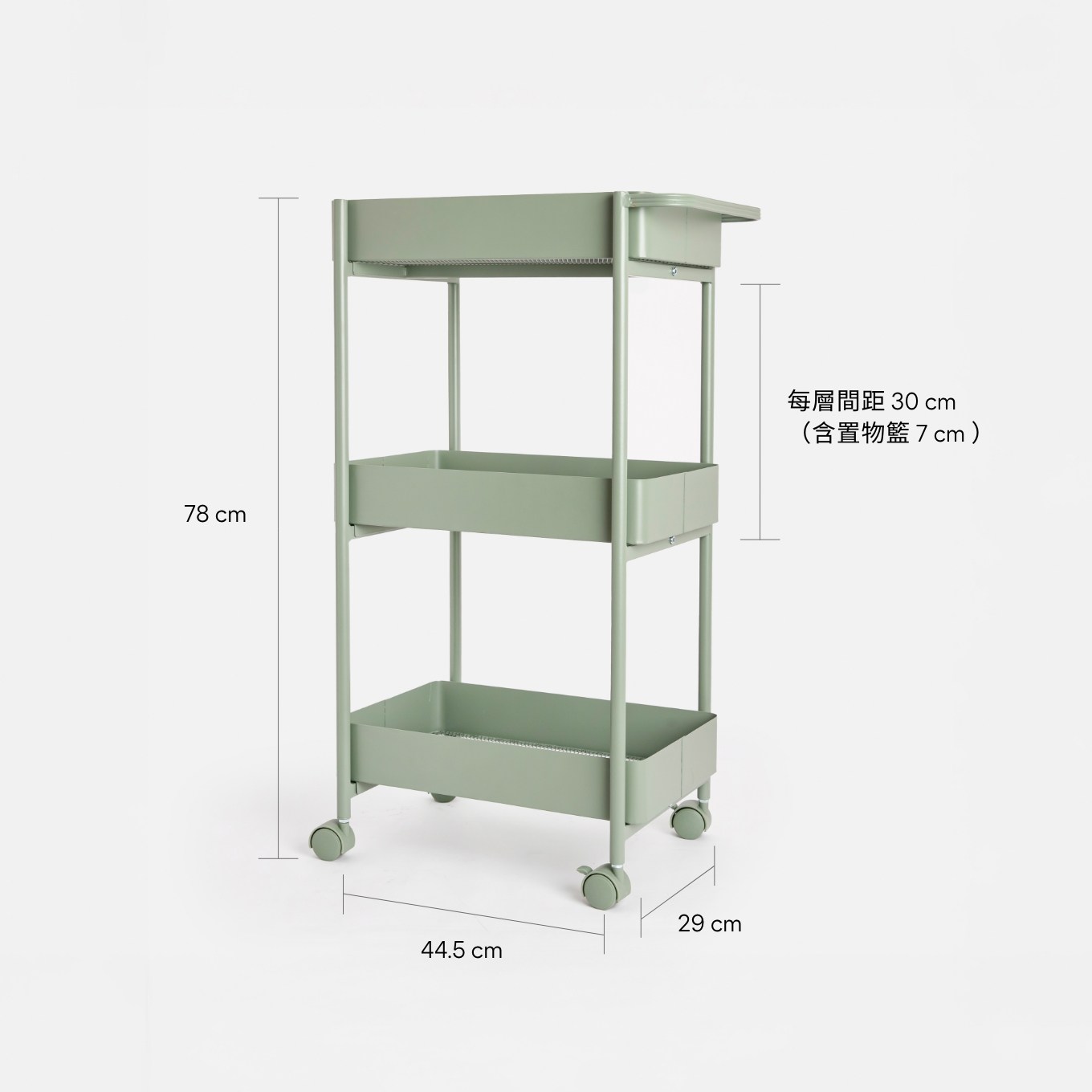 設計簡約俐落,一個人也能輕鬆組裝!4 種質感霧面烤漆色調,輕鬆融入各種空間。三層大容量,每層安全荷重達 8 kg,發揮最高坪效。通風網格乾爽透氣;360° 萬向滾輪,滑順好推亦可輕鬆固定;圓潤造型把手,靈活移動更便利,陪你玩轉美型收納日常。