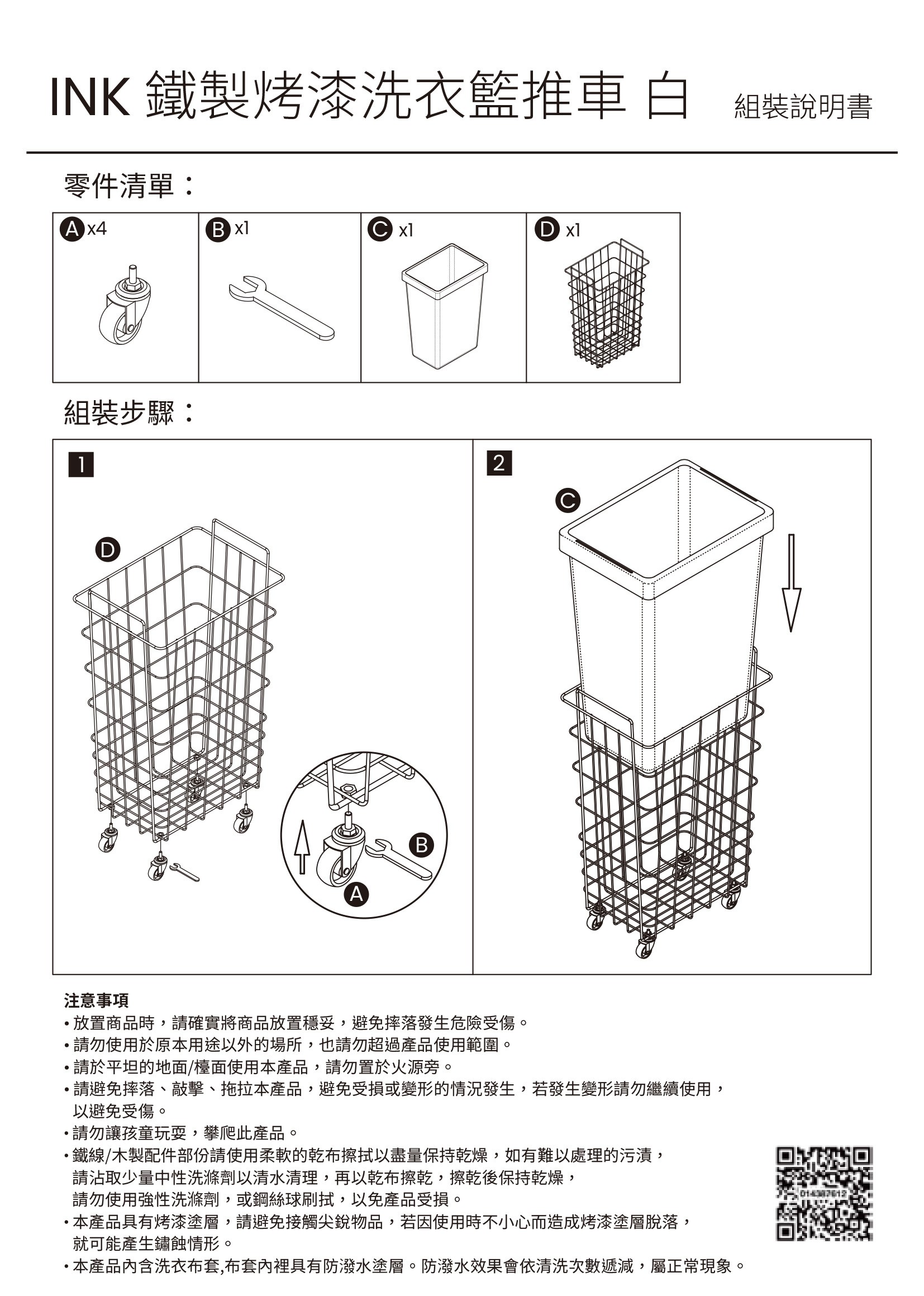 INK鐵製烤漆洗衣籃推車 附布套 白