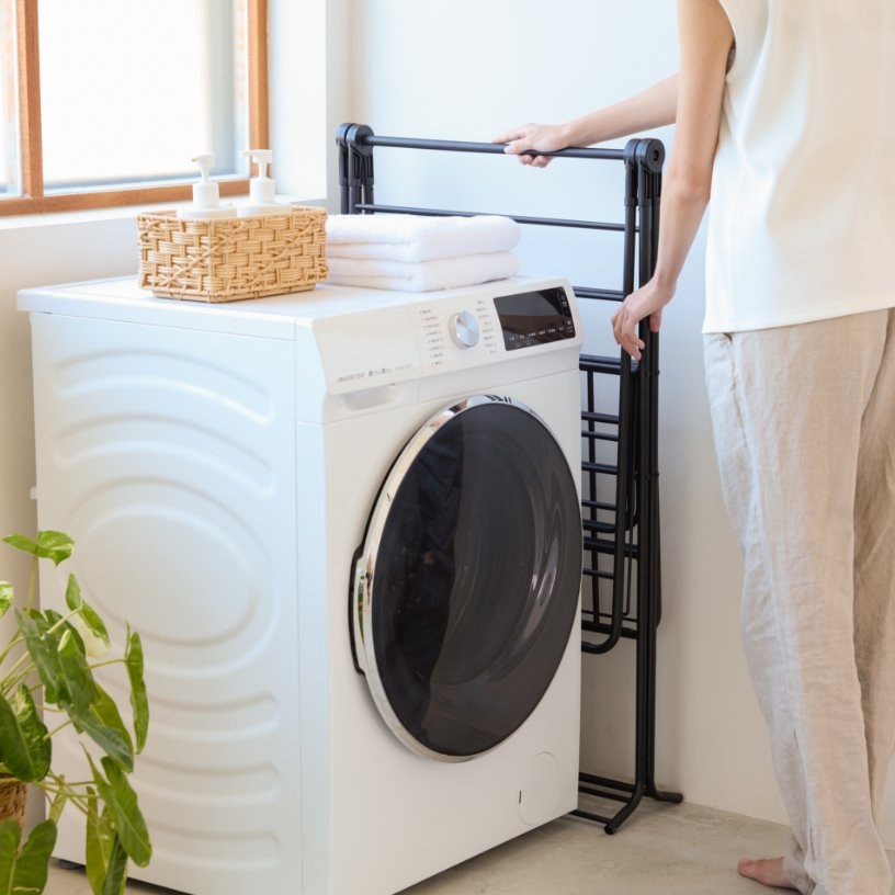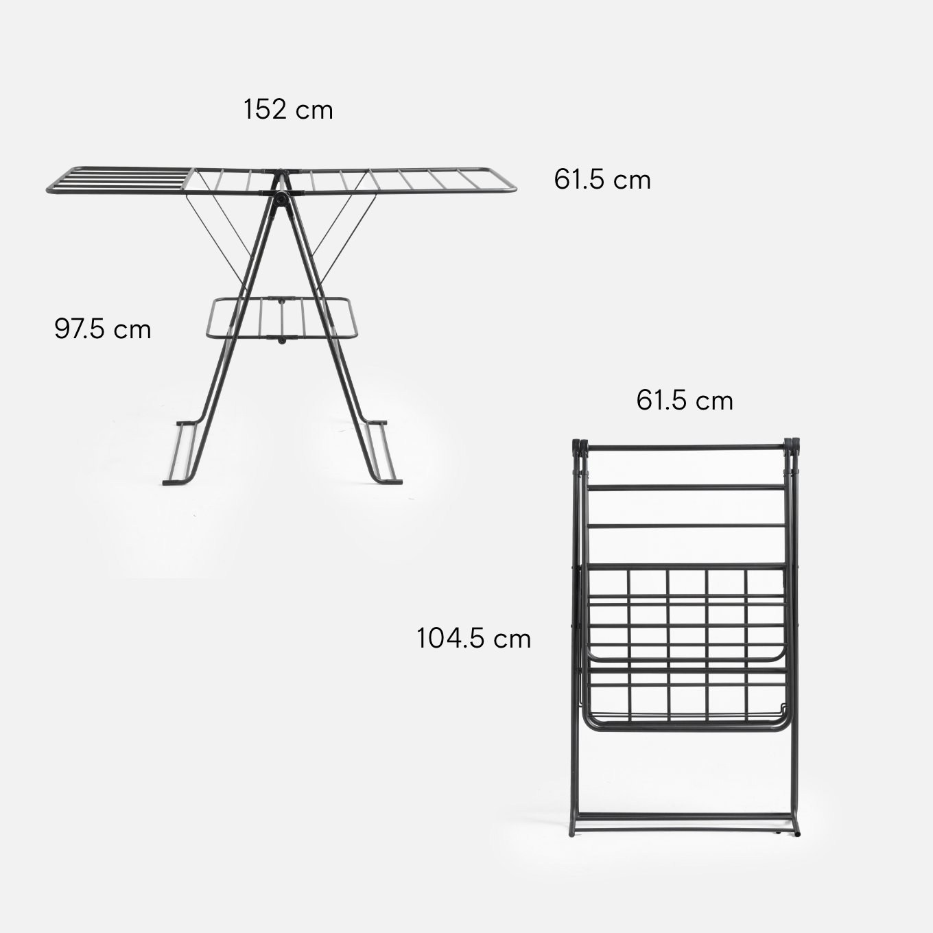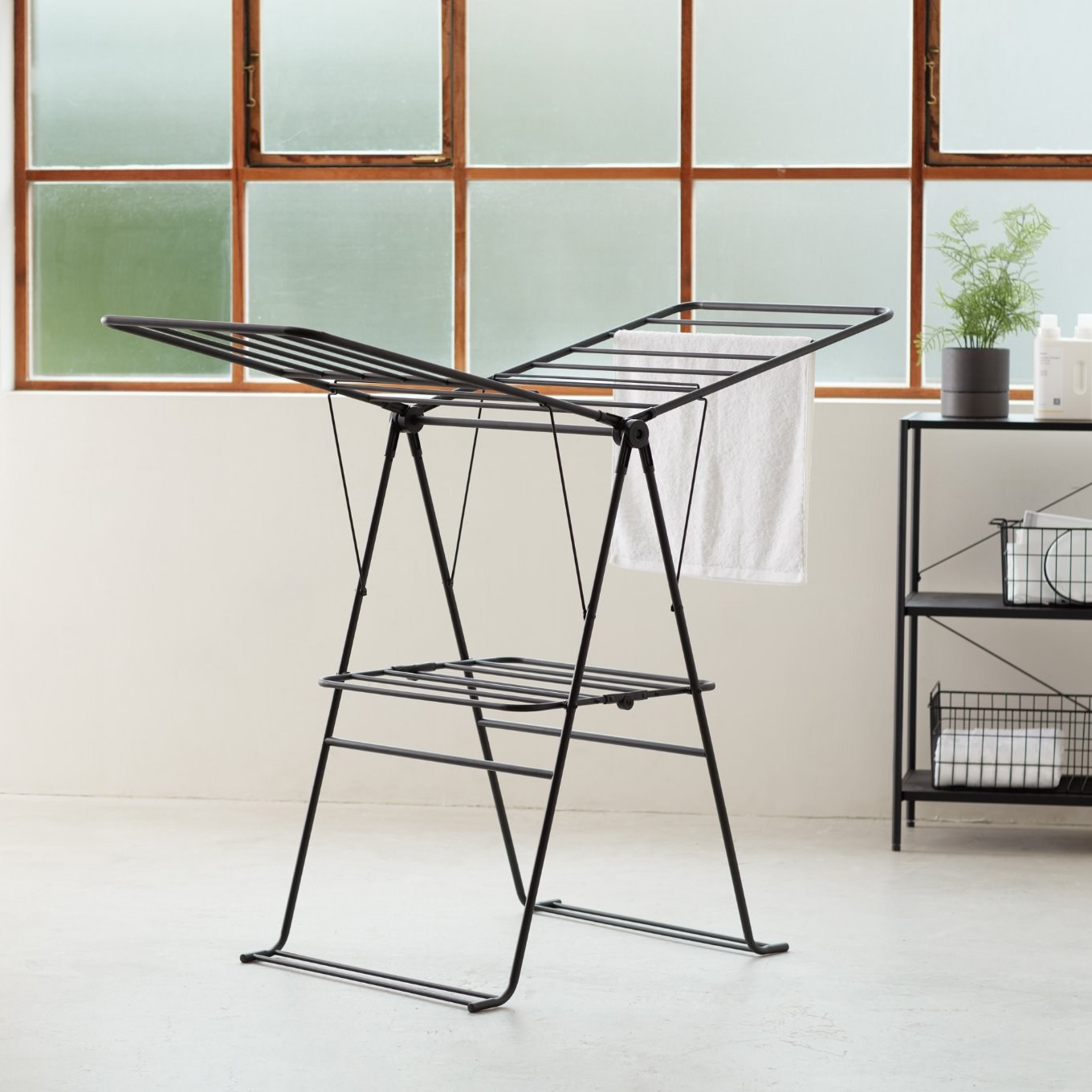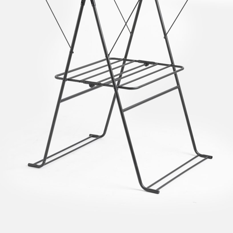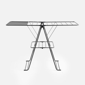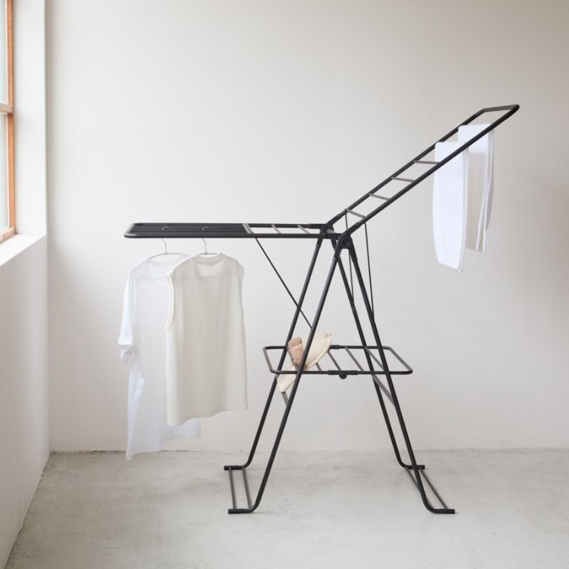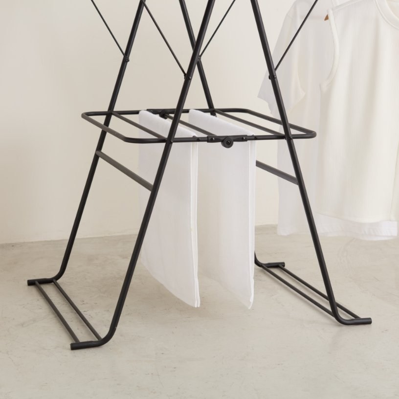 俐落沉穩的墨黑,以粉體烤漆工藝完美貼附,通過鹽霧測試 48 小時,打造具優秀抗腐蝕能力的質感曬衣架。運用簡約俐落線條,勾勒出大容量雙層曬衣空間;特殊底部支撐結構,可獨立站立不易傾倒,晾曬更安心;不須使用時可快速收摺,節省空間。針對台灣梅雨季或夏季多雨氣候,可有效解決租屋族的室內曬衣煩惱。