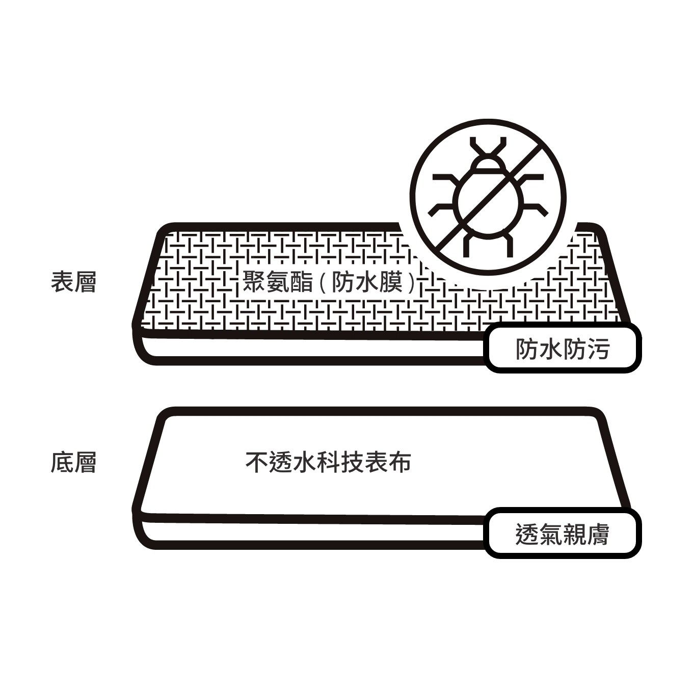 利用防水膜及輕薄透氣的科技表布之雙層結構,有效防水、防污,更利於汗水濕氣排出,維持乾爽舒適;且防水膜孔徑極小,更能阻隔塵蟎,具天然防蟎效果。