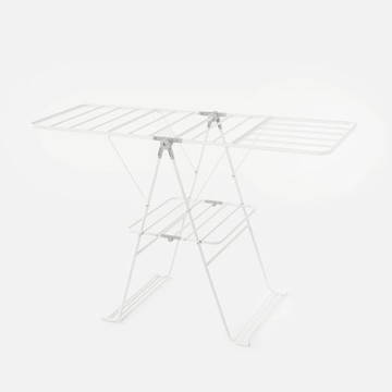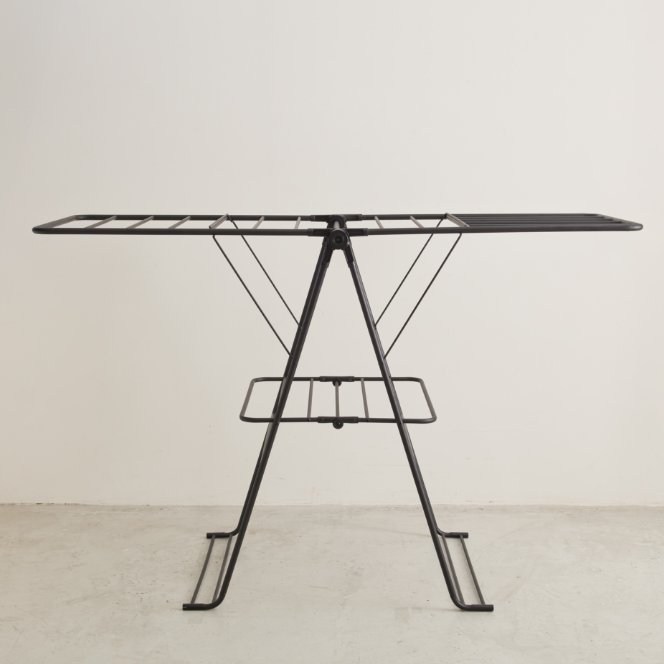 俐落沉穩的墨黑,以粉體烤漆工藝完美貼附,通過鹽霧測試 48 小時,打造具優秀抗腐蝕能力的質感曬衣架。運用簡約俐落線條,勾勒出大容量雙層曬衣空間;特殊底部支撐結構,可獨立站立不易傾倒,晾曬更安心;不須使用時可快速收摺,節省空間。針對台灣梅雨季或夏季多雨氣候,可有效解決租屋族的室內曬衣煩惱。