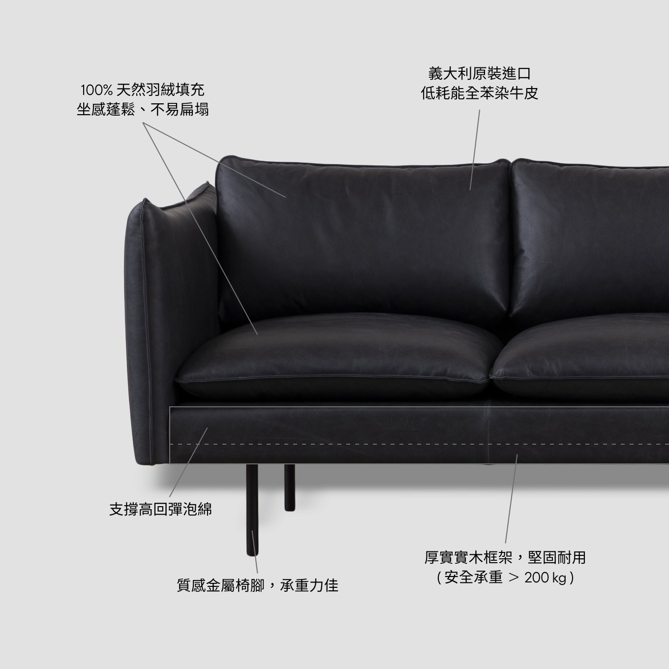 嚴選義大利原裝進口頭層牛皮,備受呵護、幾乎零瑕疵的頂級真皮經全苯染工藝處理後,保留皮革的天然質感,擁有絕佳透氣性與柔軟度。坐墊及靠墊填充 100% 天然羽絨,坐感蓬鬆 Q 彈、不易扁塌,不僅是活動式,能自由調整位置及角度,更可拆卸進行清理維護。底部框架採用厚實實木結合多層次高回彈泡綿,讓整體更具支撐力。伊登苯染牛皮沙發以頂級材質成就極致舒適,更完美演繹極上奢華的生活品味。