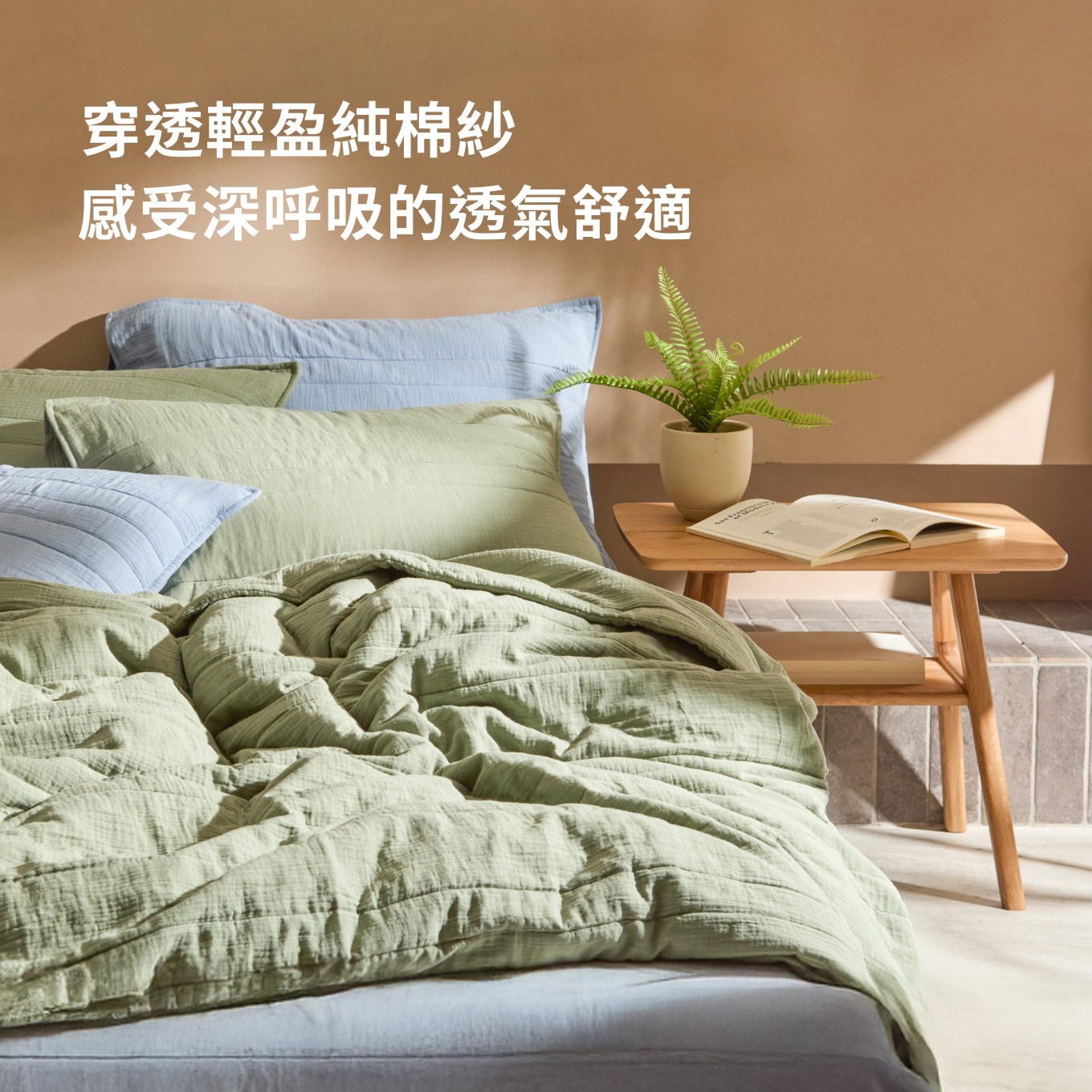 採用輕盈透氣的雙層紗布料,實現兼具蓬鬆與柔軟的觸感,給予肌膚舒適感受。並採用多針絎縫工藝,呈現出自然的蓬鬆與皺褶,營造悠閒自在的生活氛圍。在潮濕悶熱的夏夜裡,感受天然純棉的透氣覆蓋與200織紗線織造的親膚觸感,給予肌膚乾爽、舒適的涼感體驗。搭配簡約百搭的PALETTE素色色彩,能與其他寢具自由混搭不同色系,妝點屬於自己的居家臥室色彩。