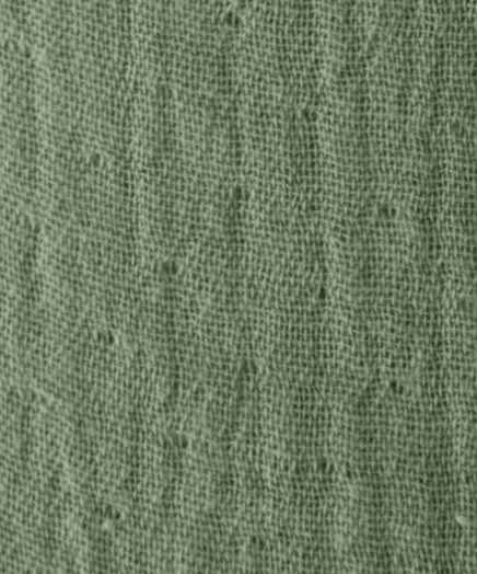 經由特殊織布機,用極細紗線透過疏密間隔以及上下交織方式,製成雙層紗布料,使兩層布料間保有空氣流動空間,實現極佳的輕盈透氣,並擁有蓬鬆柔軟的觸感,給予肌膚舒適感受。並在水洗後,呈現出自然的蓬鬆感與皺褶。