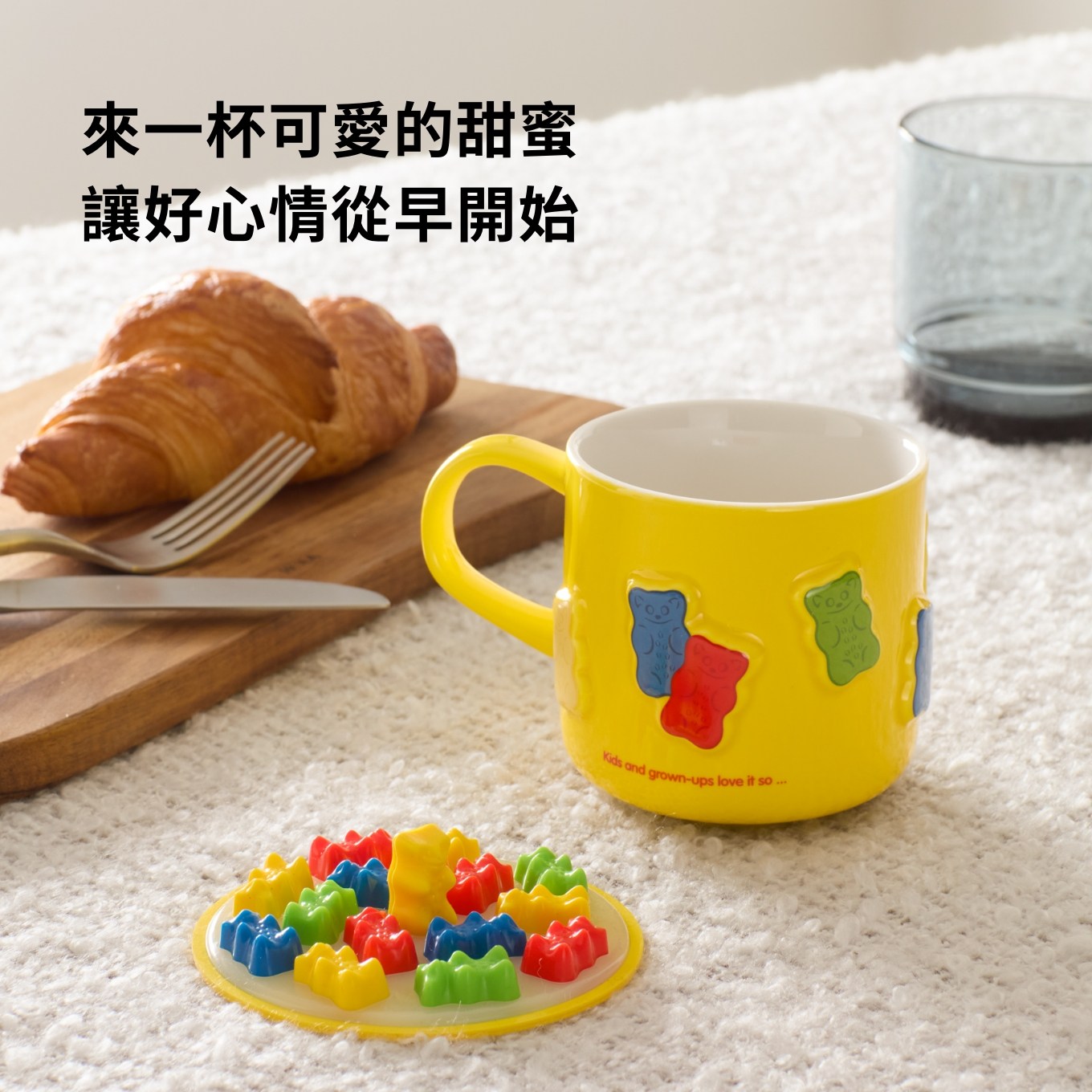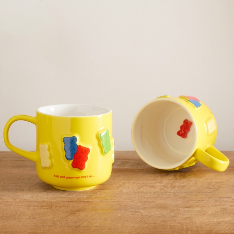 以鮮明的飽和黃底色,襯托杯身上方立體的彩色小熊圖案,更加活潑洋溢。