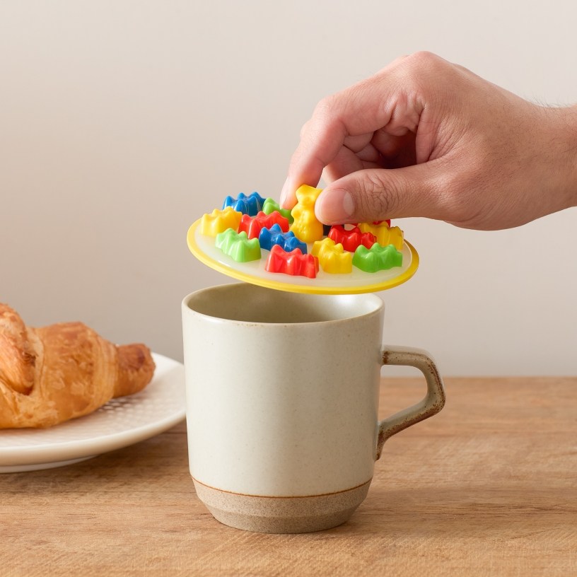 以軟糖造型作為設計的主軸,彷彿小熊們愜意得在杯上與你一起享用飲品,正中央站立的小熊,可作為把手,方便拿起杯蓋。
