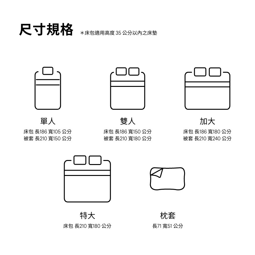 床包具有全包覆式鬆緊帶,不易移位且輕鬆更換不費力。適合高度 35cm 以內床墊。*商品按台規床墊尺寸進行製作,建議購買前先行測量以確認床墊大小(長、寬、高)