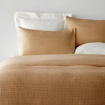 100% 純棉,運用獨特織法,織造出立體華夫格紋,觸感親膚舒適、吸濕透氣,搭配三款低彩度柔和色調:月牙白、焦糖橙、青瓷綠,伴你優雅享受輕盈好眠。