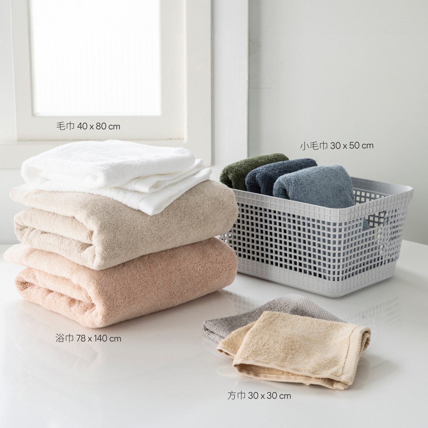 以 100% 土耳其純棉製成,厚磅蓬鬆、親膚柔軟,擁有良好吸水性。外觀設計以優雅沉穩的柔和色調,搭配極簡線條緞檔,為居家日常增添別緻質感。