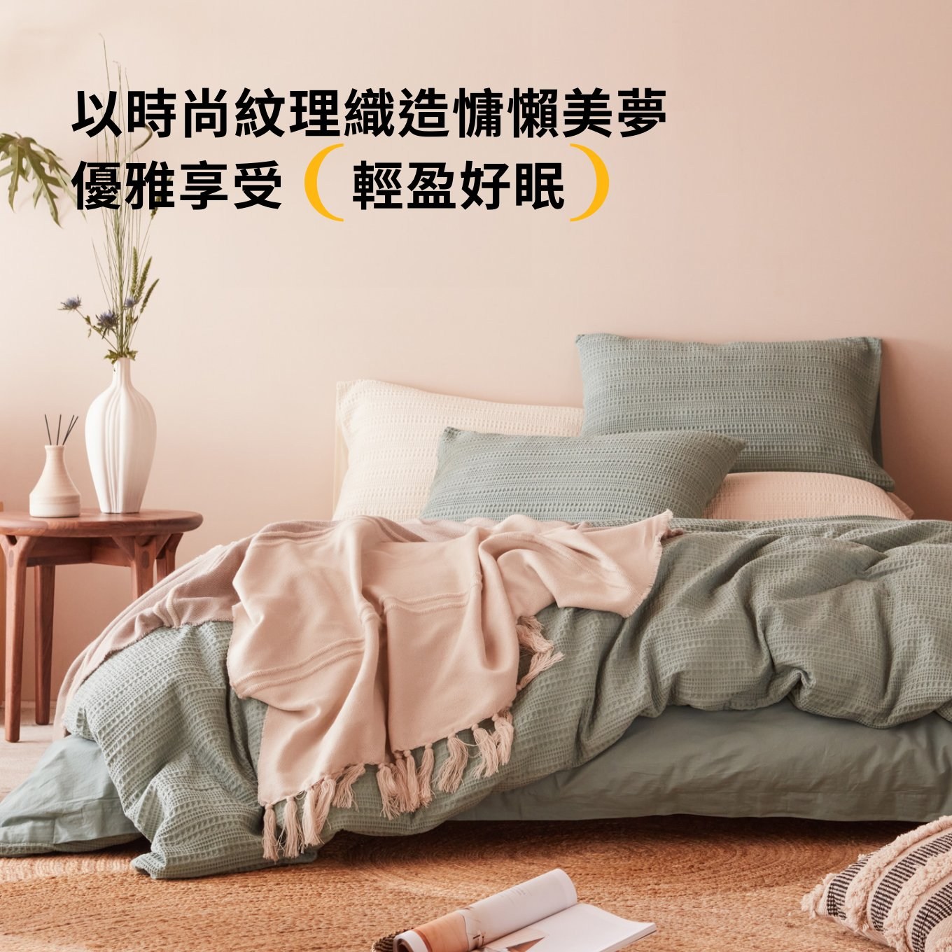 100% 純棉,運用獨特織法,織造出立體華夫格紋,觸感親膚舒適、吸濕透氣,搭配三款低彩度柔和色調:月牙白、焦糖橙、青瓷綠,伴你優雅享受輕盈好眠。
