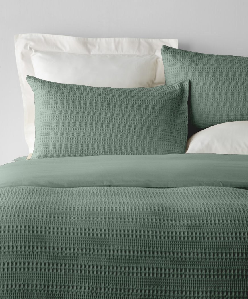 100% 純棉,運用獨特織法,織造出立體華夫格紋,觸感親膚舒適、吸濕透氣,搭配三款低彩度柔和色調:月牙白、焦糖橙、青瓷綠,伴你優雅享受輕盈好眠。