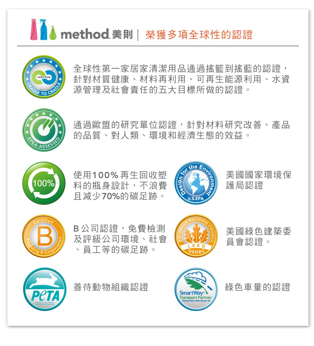 專為家中最潮濕、最容易形成眼睛看不到髒污的浴室所設計!預防皂垢及污垢的形成,沒有刺鼻的化學藥味,只有尤加利薄荷的SPA香氛,無毒害,可迅速生物分 解的配方,不對動物做測試,採用100%回收再生的材質所製造的可回收瓶罐,通過美國環保署認可!