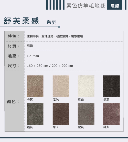 用時尚地毯增添舒適度,並有區分空間之功能~ 【舒芙柔感地毯】素面設計,質地蓬鬆,毯面緊實,毛高17mm,經典色彩美麗大方~ 【舒芙柔感地毯】時尚素色,易於搭配各式生活空間,具有保暖、吸音、減震等功能,增添居家生活情趣,創造優質居家品質~