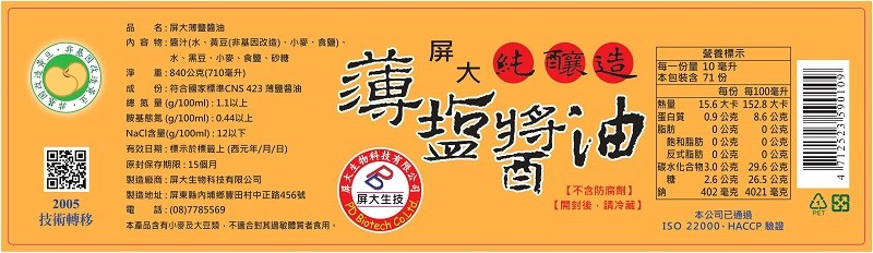 屏科大(非基改)薄鹽醬油710ml