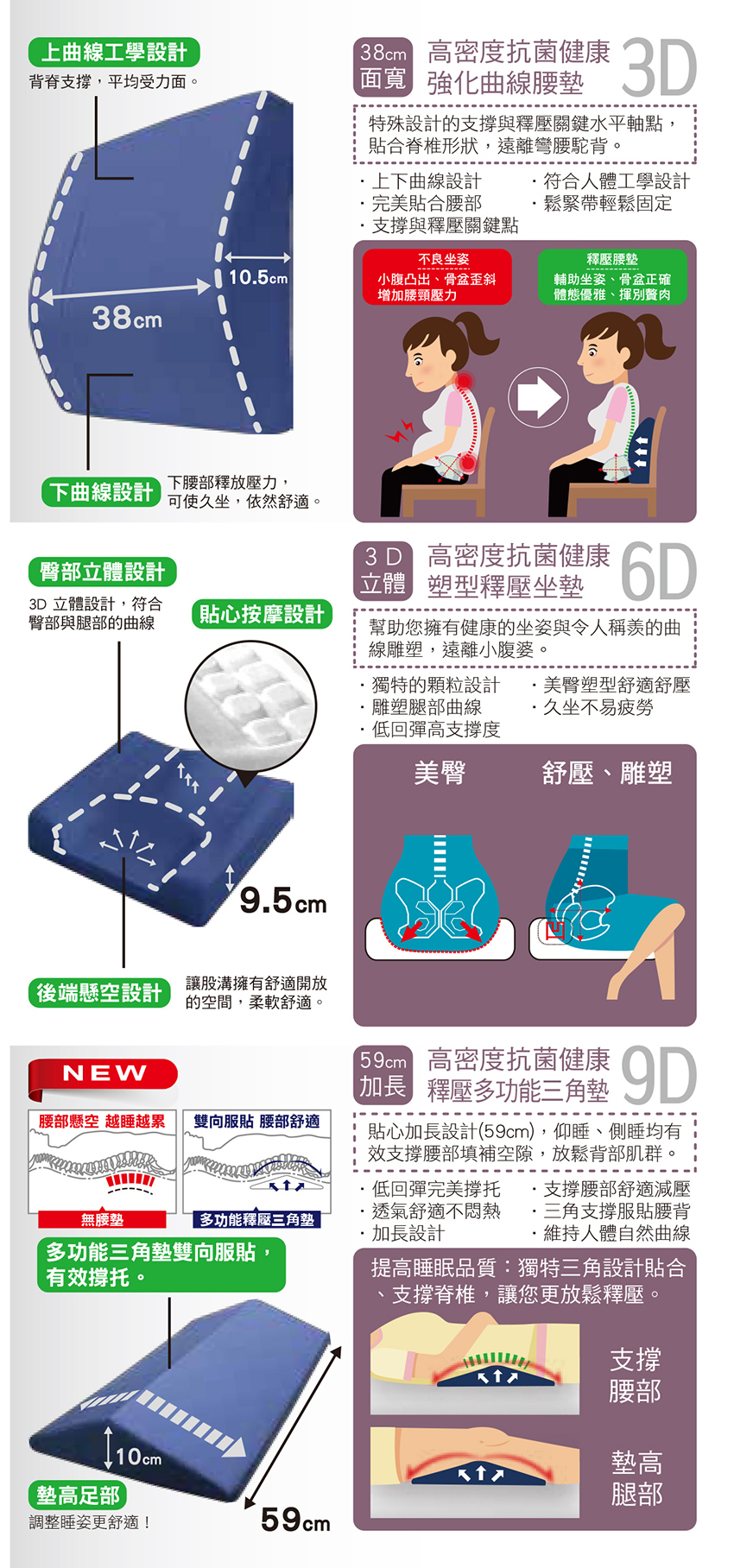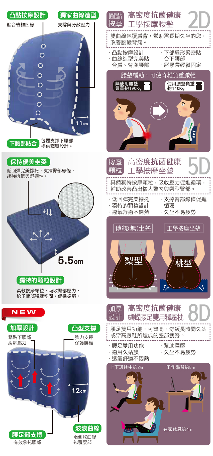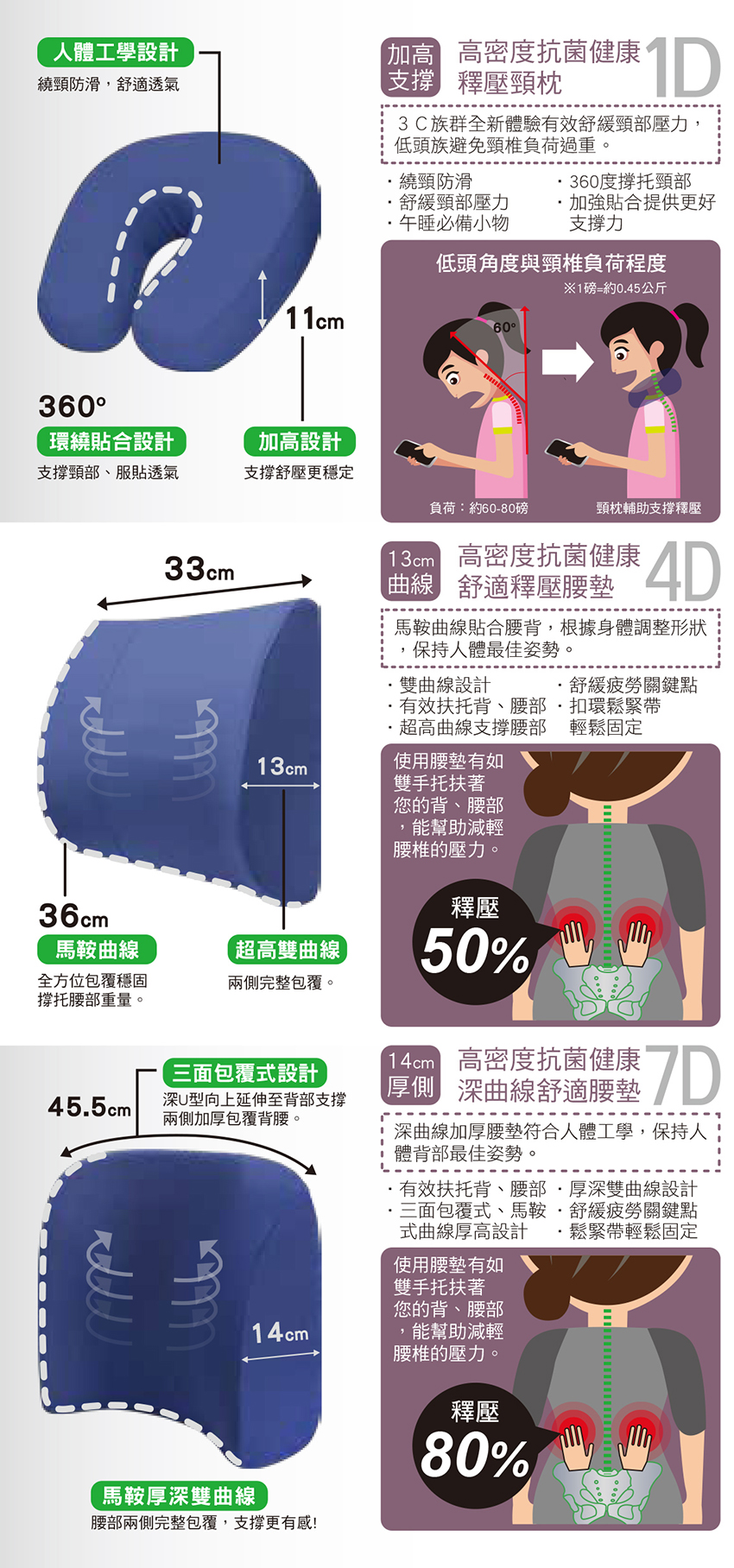 【高密度抗菌健康釋壓曲線腰墊】特殊設計的支撐與釋壓關鍵水平軸點, 幫助需長期久坐的您, 改善腰酸背痛, 完美的釋壓, 貼合脊椎骨形狀, 保持人體背部最佳姿勢, 遠離彎腰駝背。
