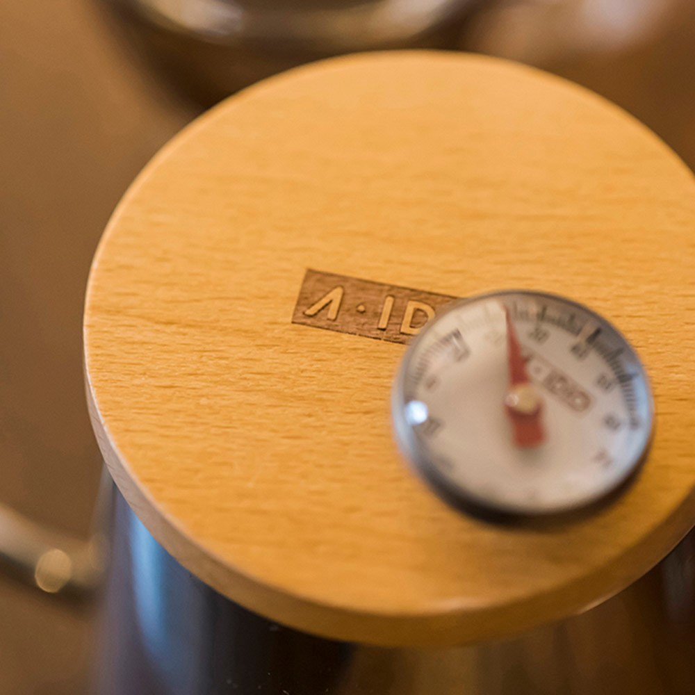 櫸木壺蓋質感溫潤,搭配專業溫度計,辨識溫度一目了然
