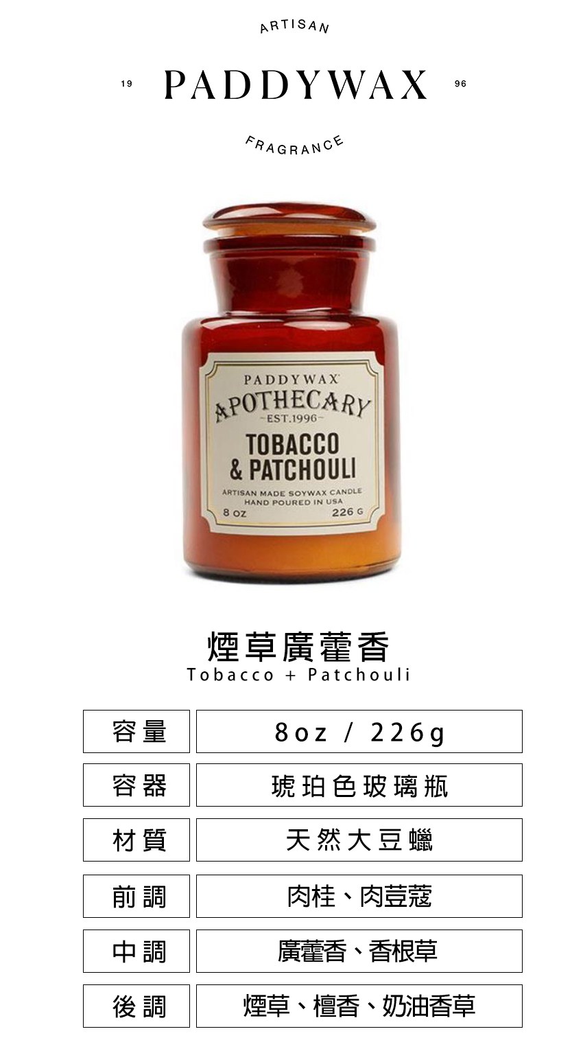 美國Paddywax 藥劑師系列 煙草廣藿香 香氛蠟燭 226g